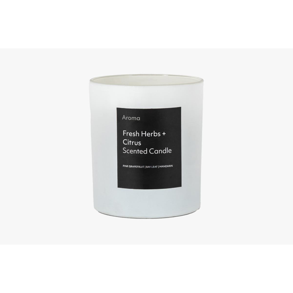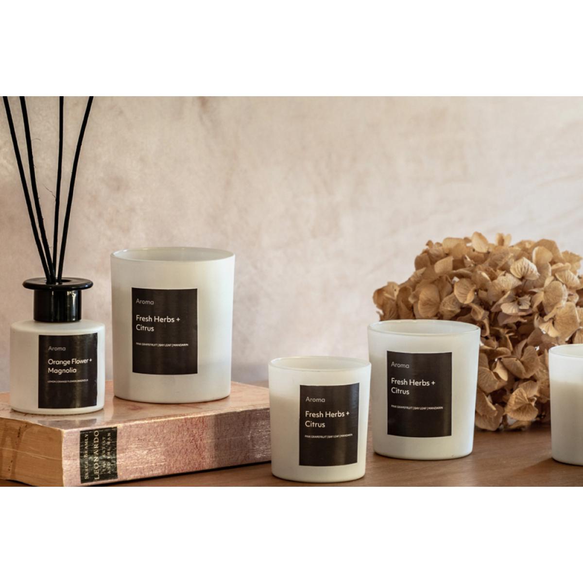 Set the mood and fill your room with the beautiful aroma of Fresh Herbs & Citrus. The chic white glass candles' zesty & aromatic scent will infuse your space, creating the perfect relaxing atmosphere. Approximately 45 hours of burn time.