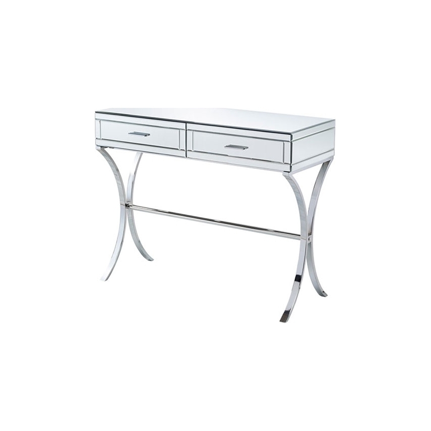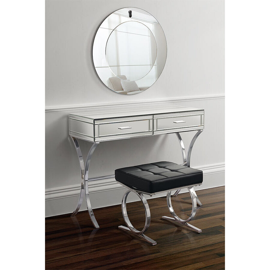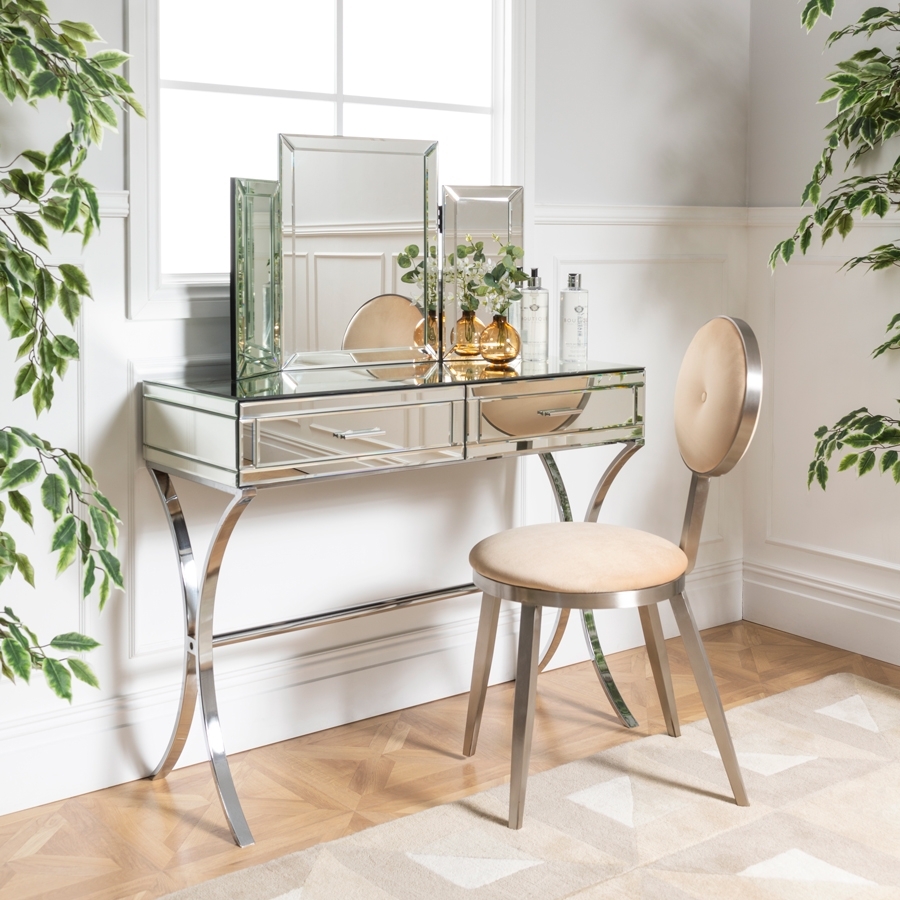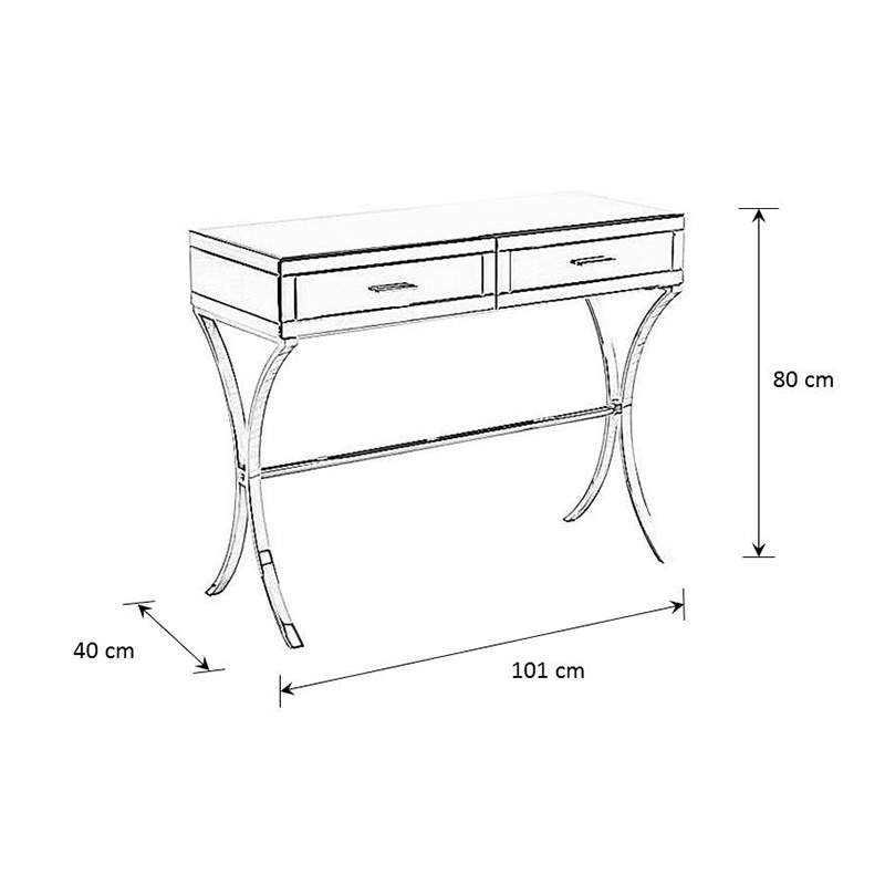 Elegant and stylish this Barcelona style Mirrored and chrome dressing table or hall console will make any room feel lighter and brighter. This timeless classic console is beautifully finished in high quality bevelled mirror and set up-on solid steel chrome plated legs that simply looks stunning! Features 2 drawers and Requires minimal assembly (aprox. 10 minutes to attach the legs to the main body)