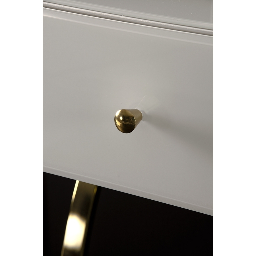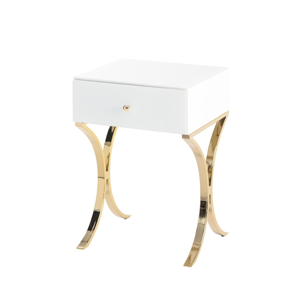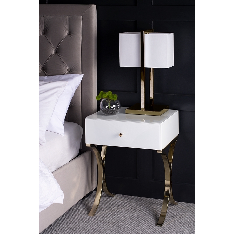 A timeless, elegant bedside table. Top constructed from white painted board, clad in toughened, white, bevelled edge glass. Spacious drawer for keeping essential items close at hand. Steel frame and handles with Champagne Gold electroplated finish. Minimal assembly required.