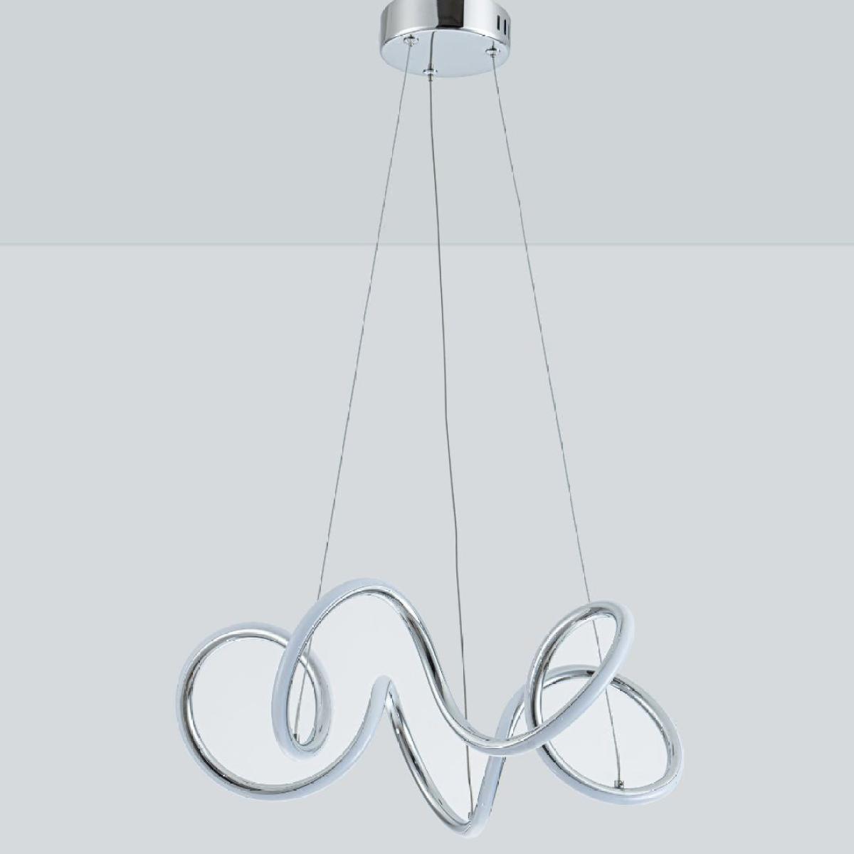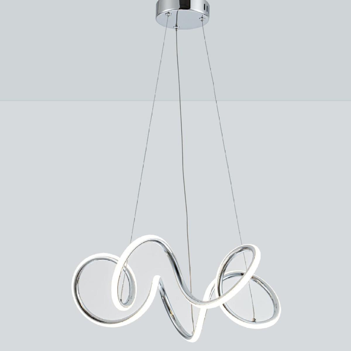 Aurielle LED pendant ceiling light, featuring a polished chrome finish. The Aurielle LED pendant ceiling light is a stunning example of contemporary design and sculptural elegance. Crafted with a sleek polished chrome finish, the pendant showcases a fluid, ribbon-like LED structure that twists and loops gracefully, creating a captivating visual centrepiece. Suspended from adjustable cables, the Aurielle appears to float effortlessly in the air, making it ideal for dining areas, entryways or modern living rooms. The integrated LEDs emit a soft warm white glow that brings a welcoming and ambient atmosphere to any space, while also being energy-efficient and long-lasting. Stylish and striking, the Aurielle is designed to impress from every angle.