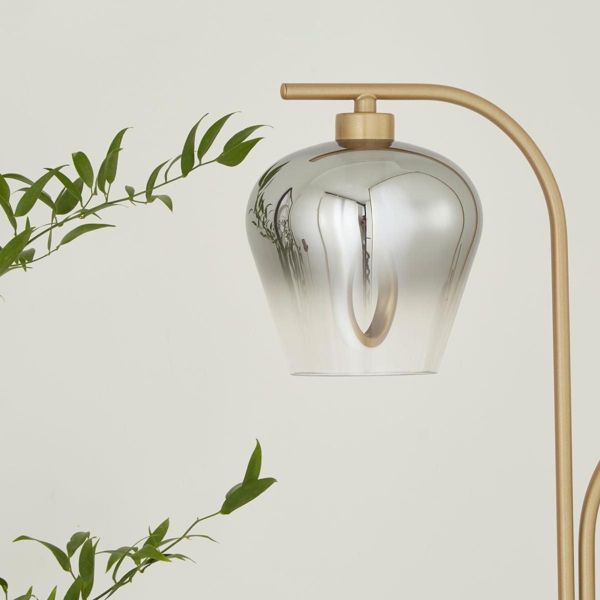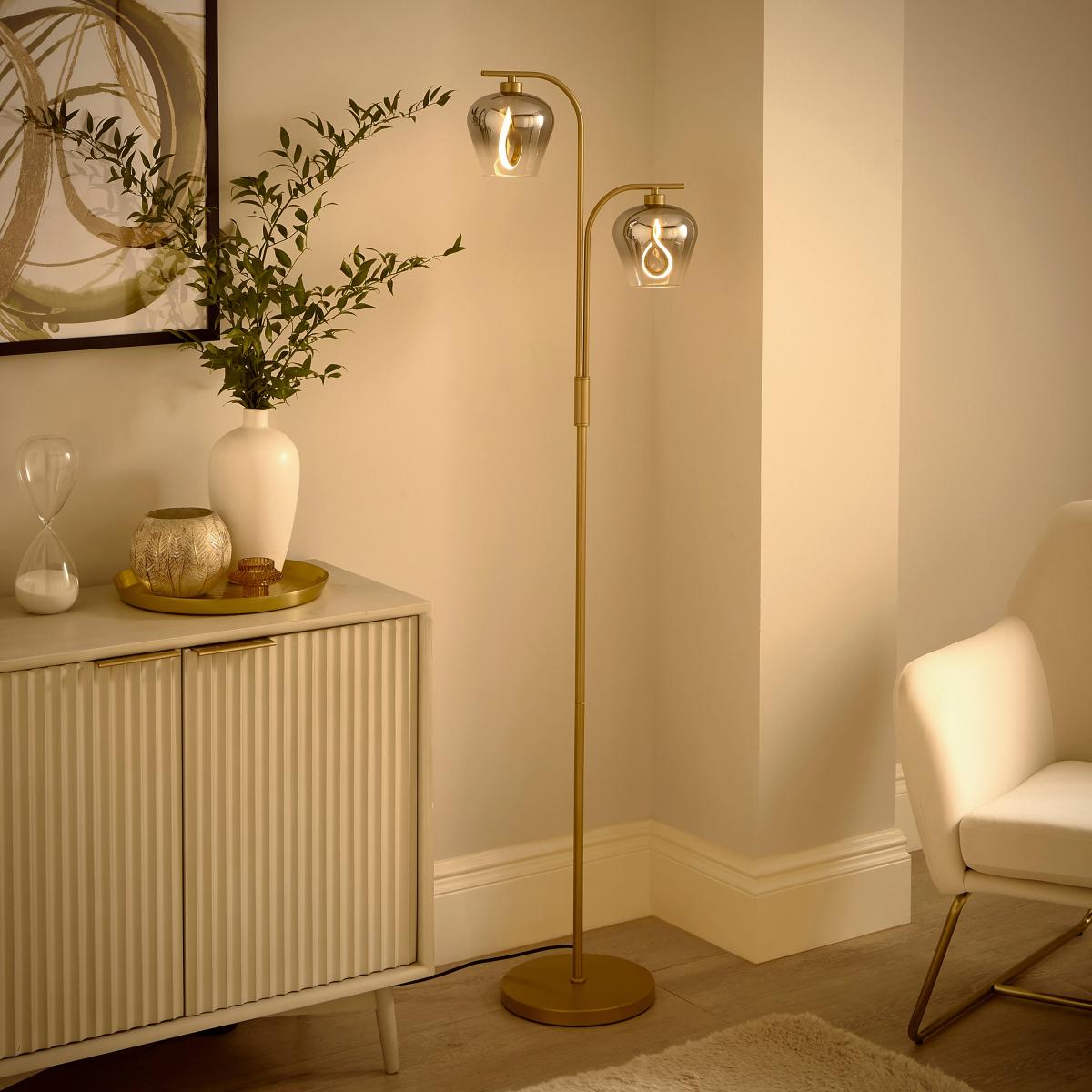 * Modern, Eye-Catching Design* Ombre Smoked-Glass Effect* Includes 2 Integrated LE Ds - Warm White Glow* G Energy Rating Striking in design, the Aurora 2 Light LED Floor Lamp is the perfect addition to your living space. It boasts a modern ombre, smoked-glass effect, integrated LED lights that emit a warm white glow, and a beautiful gold colourway.