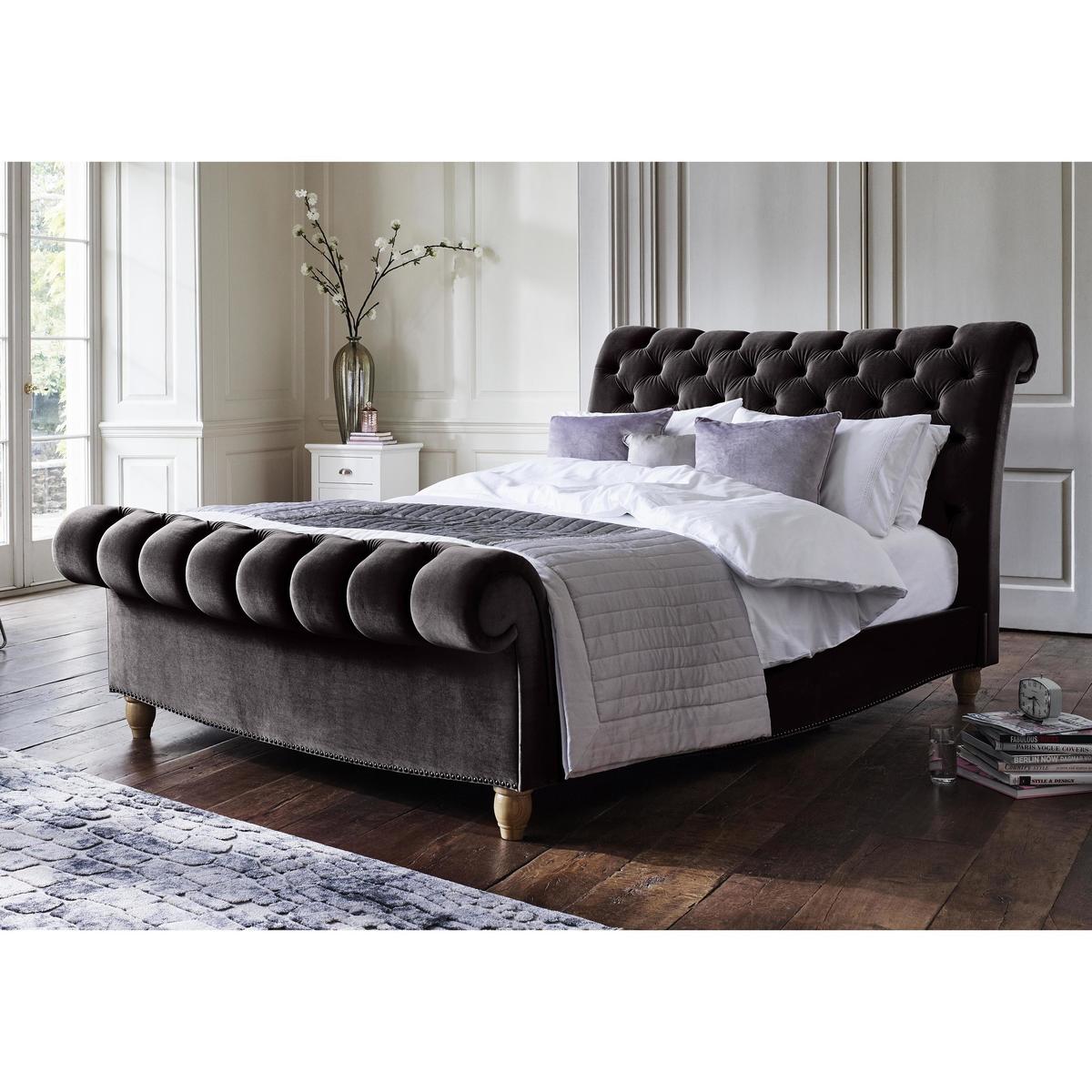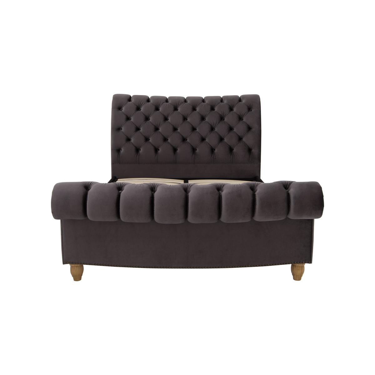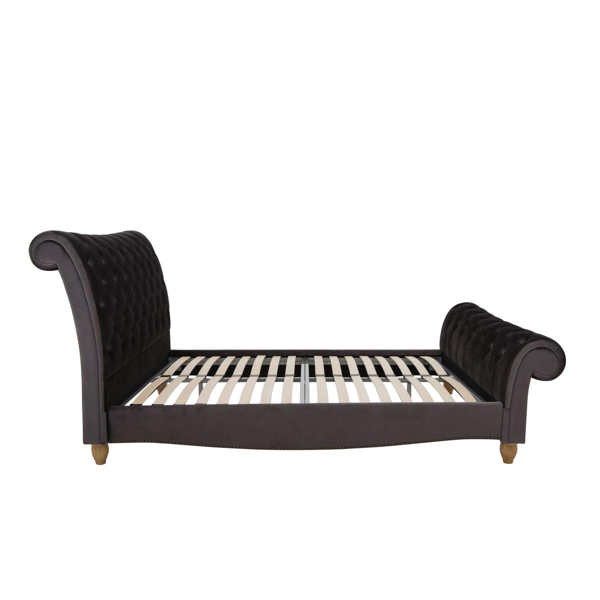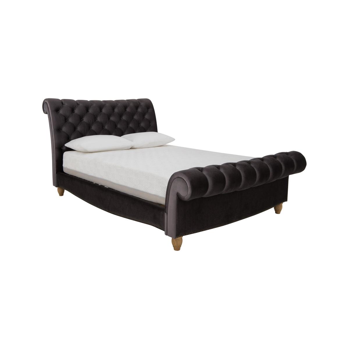 L ength of frame including the scrolling ends exceeds 8ft. Such elegance, such value. The handcrafted Aurora bed frame is quite stunning, with its dramatic silhouette and lavish upholstery. And yet it’s available at a quite outstanding price. Beautifully upholstered in soft velvet in a fashionable dark grey colour, this elegant bed frame feels luxurious and opulent. The headboard and footboard scroll beautifully, the headboard is deeply buttoned and the footboard features stylish vertical fluting. Shaped wooden feet in a natural-coloured finish complete this bed frame’s elegant look. But the beauty of this bedframe is more than skin deep. With well-sprung slats, it supports standard size mattresses and promises a wonderfully comfortable nights’ sleep. Easy to assemble, the Aurora bed frame is a gorgeous statement piece for any style of bedroom. A Furniture Village exclusive. Mattress sold separately