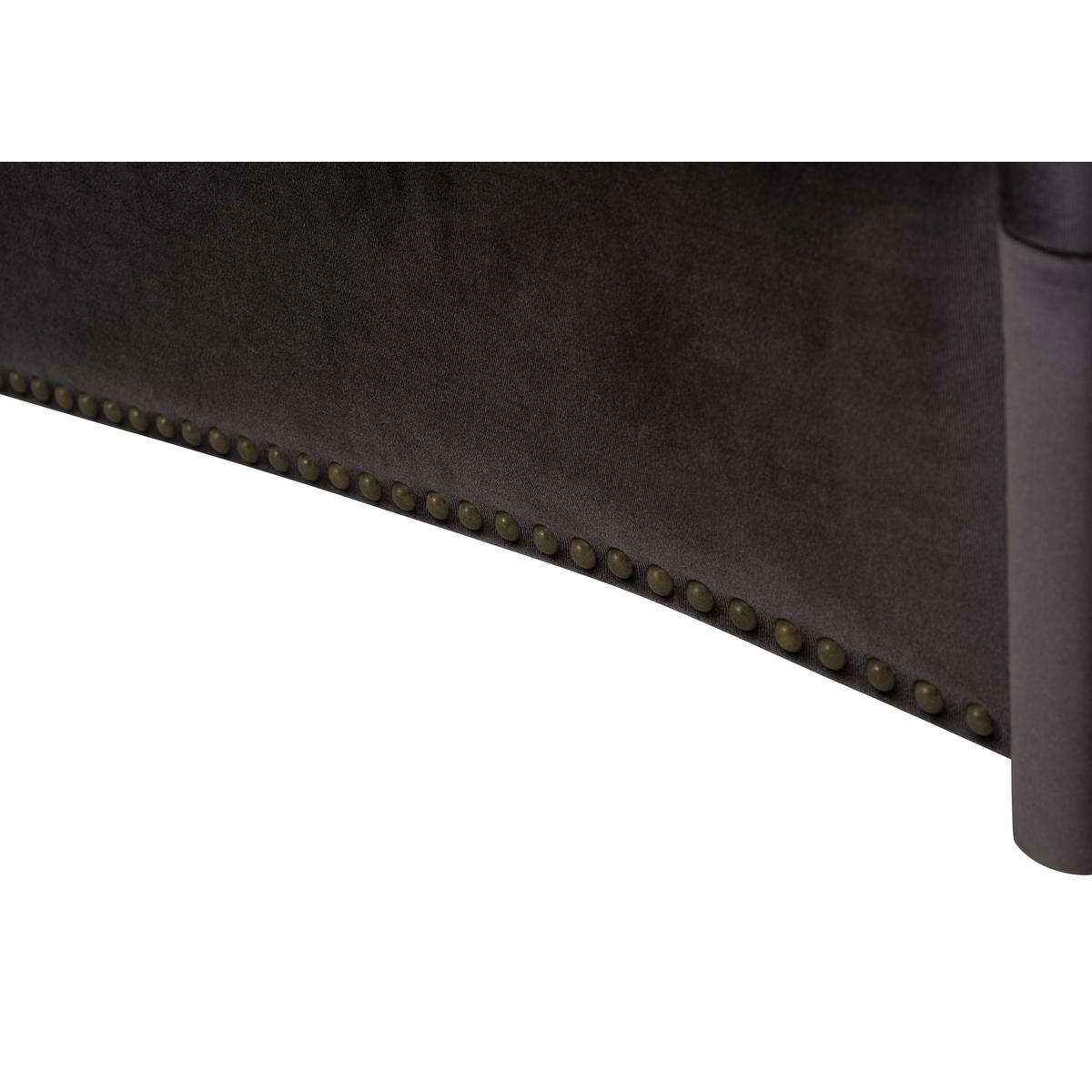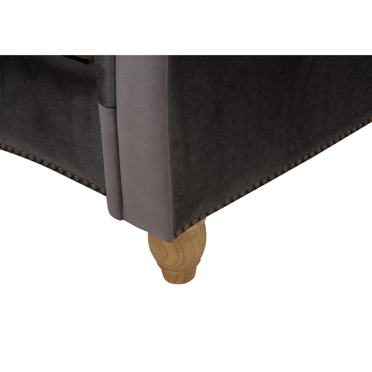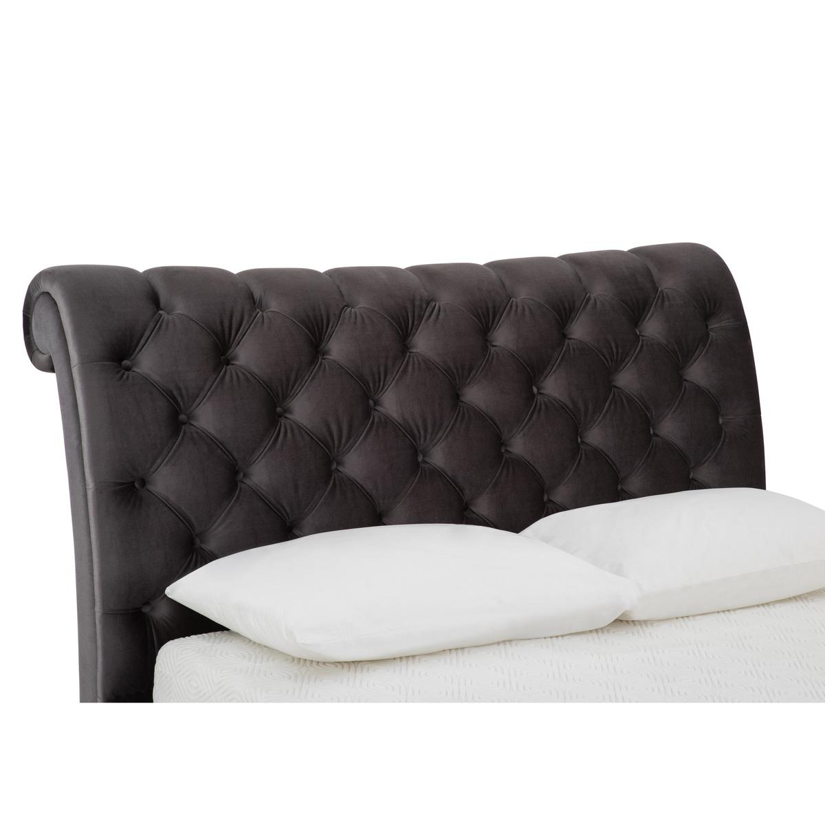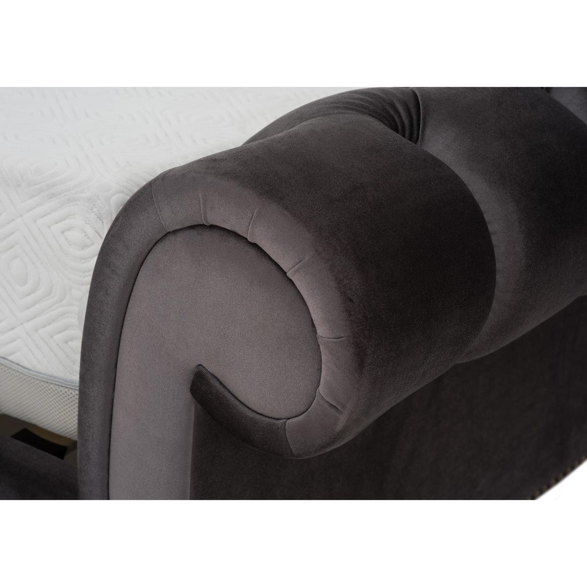 L ength of frame including the scrolling ends exceeds 8ft. Such elegance, such value. The handcrafted Aurora bed frame is quite stunning, with its dramatic silhouette and lavish upholstery. And yet it’s available at a quite outstanding price. Beautifully upholstered in soft velvet in a fashionable dark grey colour, this elegant bed frame feels luxurious and opulent. The headboard and footboard scroll beautifully, the headboard is deeply buttoned and the footboard features stylish vertical fluting. Shaped wooden feet in a natural-coloured finish complete this bed frame’s elegant look. But the beauty of this bedframe is more than skin deep. With well-sprung slats, it supports standard size mattresses and promises a wonderfully comfortable nights’ sleep. Easy to assemble, the Aurora bed frame is a gorgeous statement piece for any style of bedroom. A Furniture Village exclusive. Mattress sold separately
