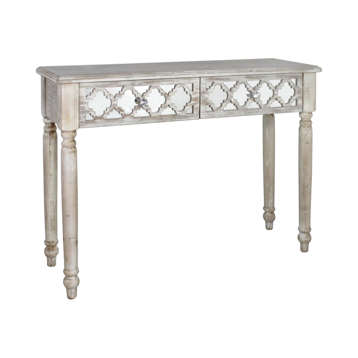 Dimensions:W107 x H82 x D36cm Transform your living or dining room into a lavish luxury haven, steeped in opulence and extravagance. Featuring curvy lines and points, overlaid onto mirrored panels, this bold, on-trend geometric furniture collection will add drama and statement to any interior. Sturdy and practical as well as beautifully stylish; with spacious a top to display your own accessories. Console colour can vary due to made of natural wood with white varnish to give the wash ash look. Features: 2 Drawer mirrored console Mirror combined with a natural wood and white varnish finish Beautiful Geometric pattern Extravagant on trend design Drawers are supported with metal ball runners Built with quality materials Spacious a top to display your own accessories Storage space inside, no internal shelves Please avoid contact with liquid to avoid any water damage This unit is shipped with White Glove service with assembly included