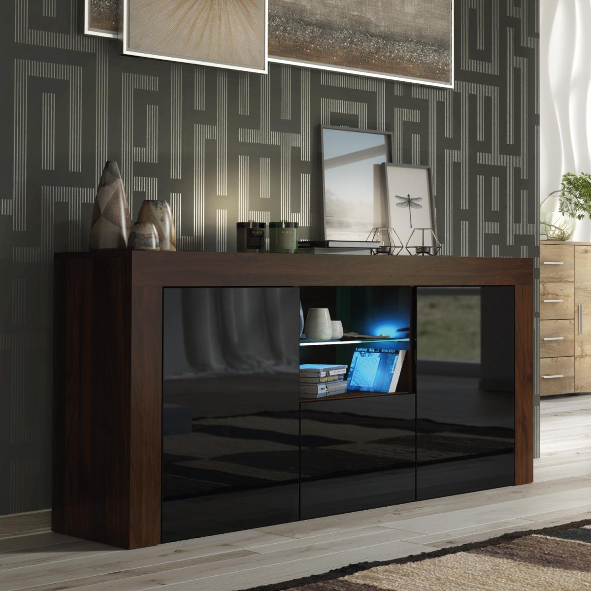 The Aurora Sideboard strikes the perfect balance between modern design and practical storage, serving as a sleek and stylish addition to your living space. Measuring 145cm (W) x 70cm (H) x 35cm (D), this versatile piece combines contemporary elegance with everyday functionality, making it an excellent choice for any home. The design features two push-to-open doors on each side, concealing spacious compartments with internal shelves to help you stay organized and keep your space tidy. The smaller central doors provide additional hidden storage, ideal for stashing away clutter or everyday items. At the heart of the sideboard, an open compartment divided by a sleek glass shelf offers ample space for media devices, decorative items, or household essentials. To elevate its modern aesthetic, the included LED lighting highlights the glass shelf, creating a warm and inviting ambiance that enhances the overall design. Crafted from durable 16mm chipboard and MDF, the Aurora Sideboard is built for long-lasting quality while maintaining its sleek and sophisticated appearance. Please note the Oak with Black version features matte black doors, providing a unique and understated alternative to the glossy finishes available in other options. Available in White Gloss Doors, White Grey Gloss Doors, Black Gloss Doors, Walnut Black Gloss Doors, Oak White Gloss Doors, Oak Black Matt Doors, and Dark Grey Gloss Doors, the Aurora Sideboard is the perfect blend of style and practicality for any modern home.