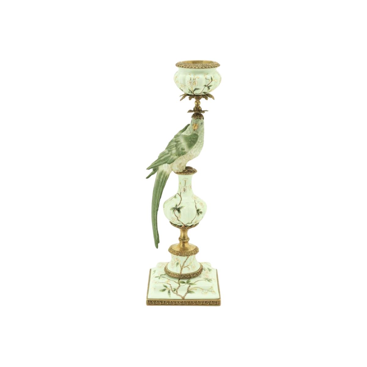 This elegant candleholder features a lifelike songbird perched atop a decorative column, bringing a touch of nature's beauty to your home. Its intricate design and soft green palette make it perfect for adding a romantic, vintage-inspired accent to mantels, dining tables, or side tables, while functionally holding a taper candle for ambient lighting.