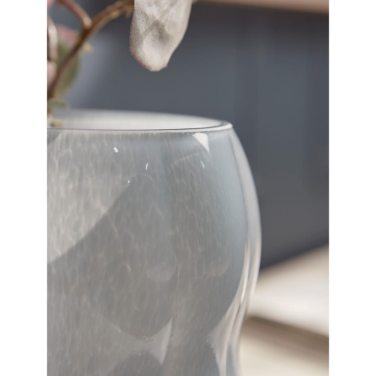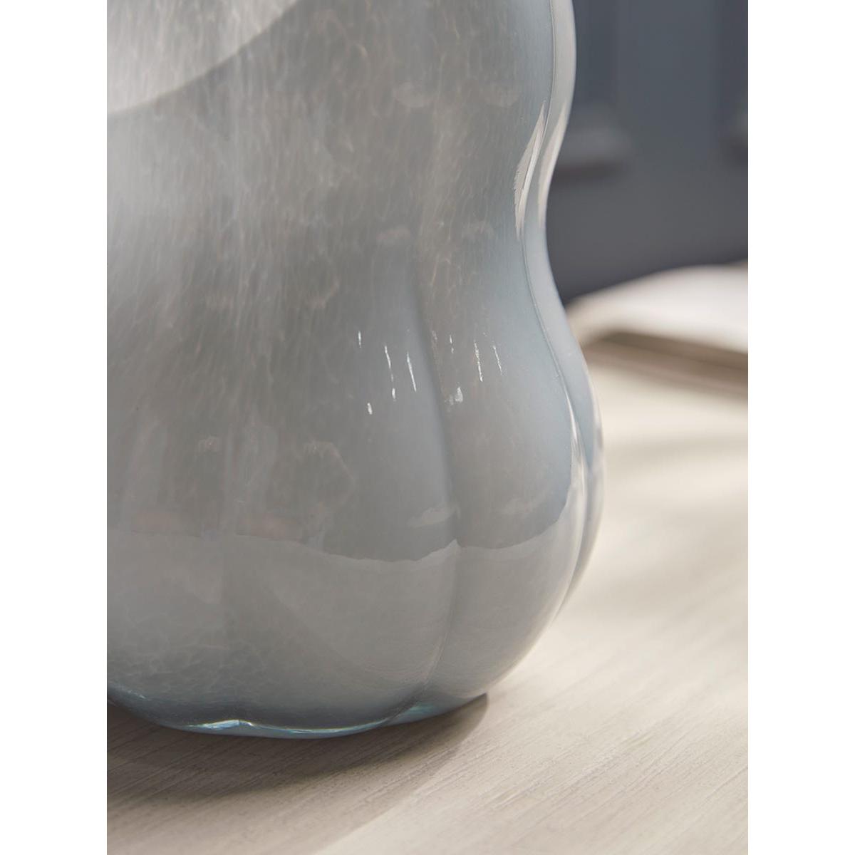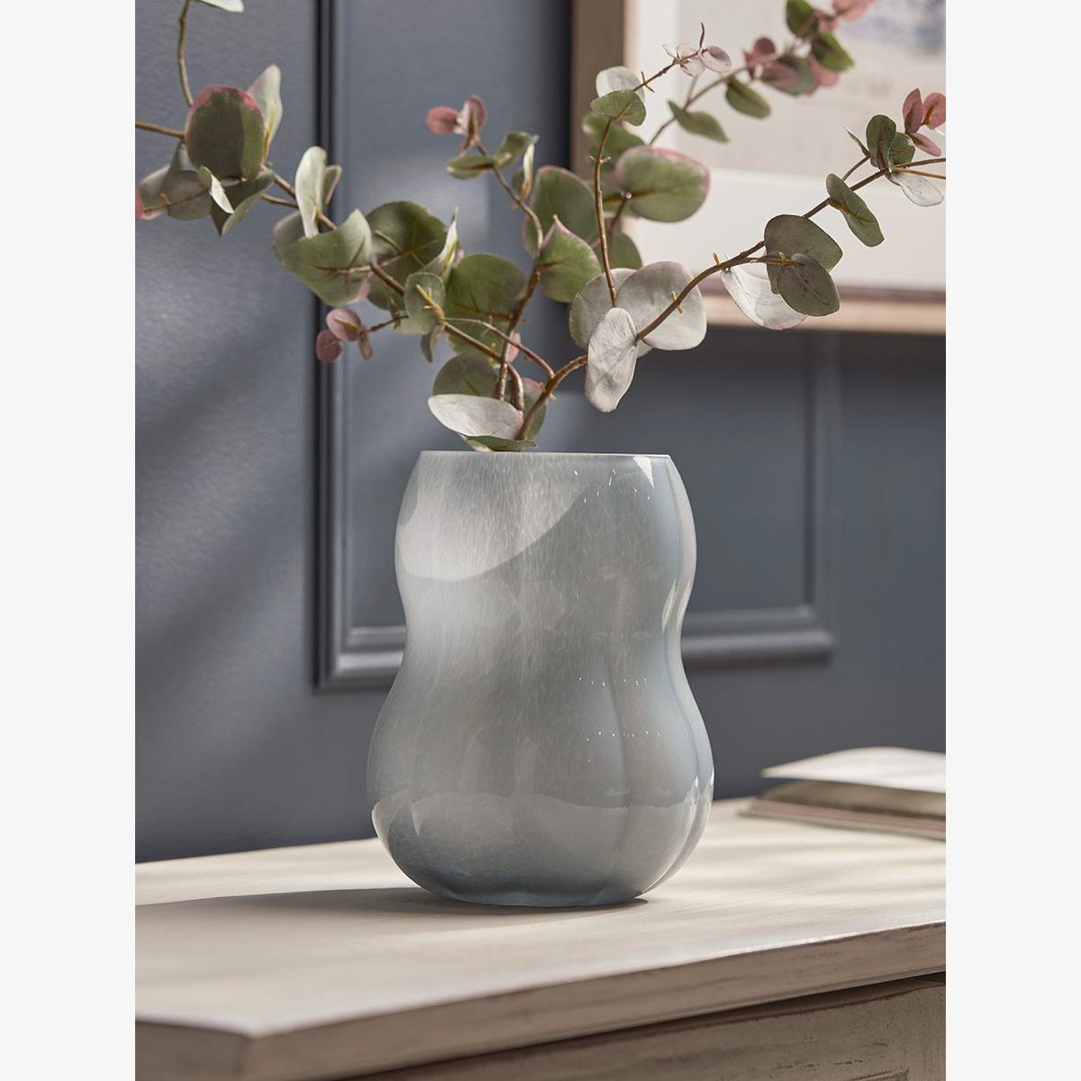 Our Ausha vase is mouth-blown to create a unique appearance to each vase. In cool blue, grey tones, this vase has vertical grooves and a gently curved shaped, creating softness and elegance.  As part of our French Blue collection, this vase adds serenity and calm to your home.