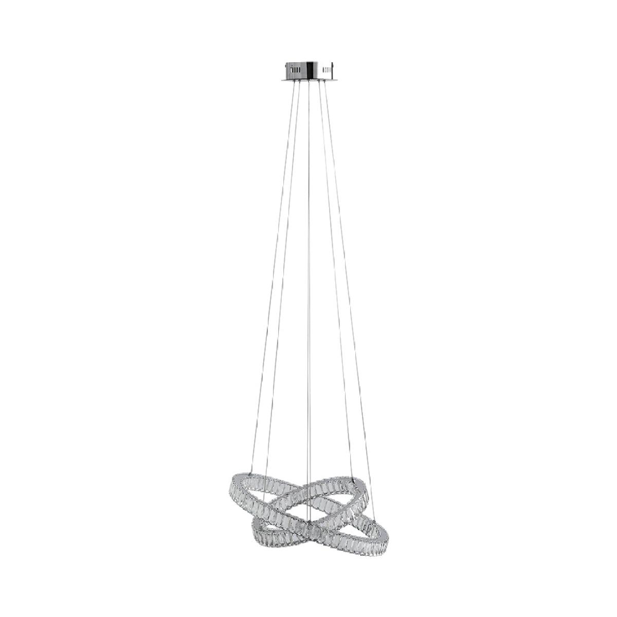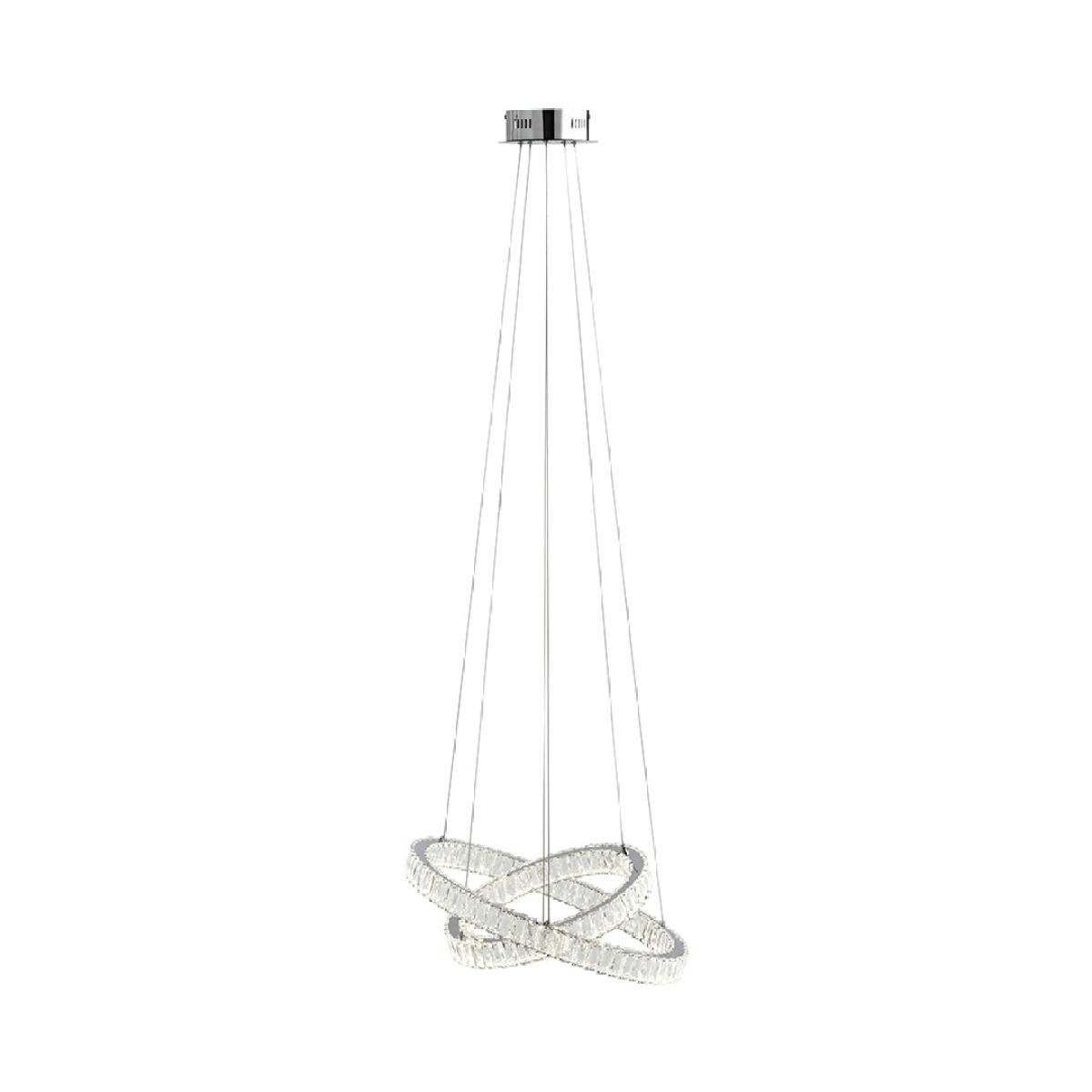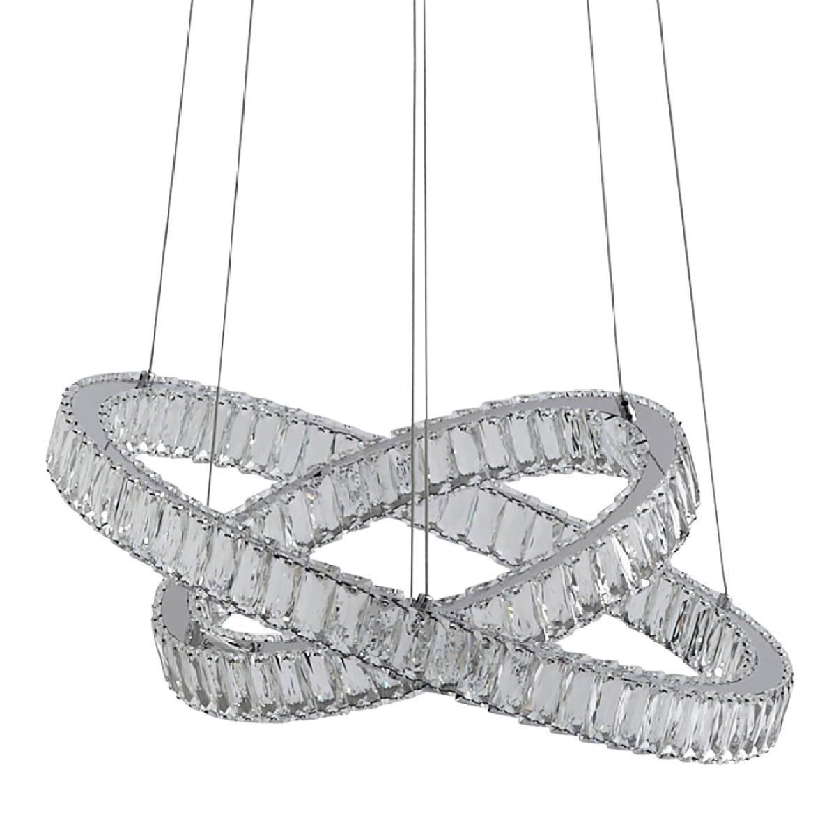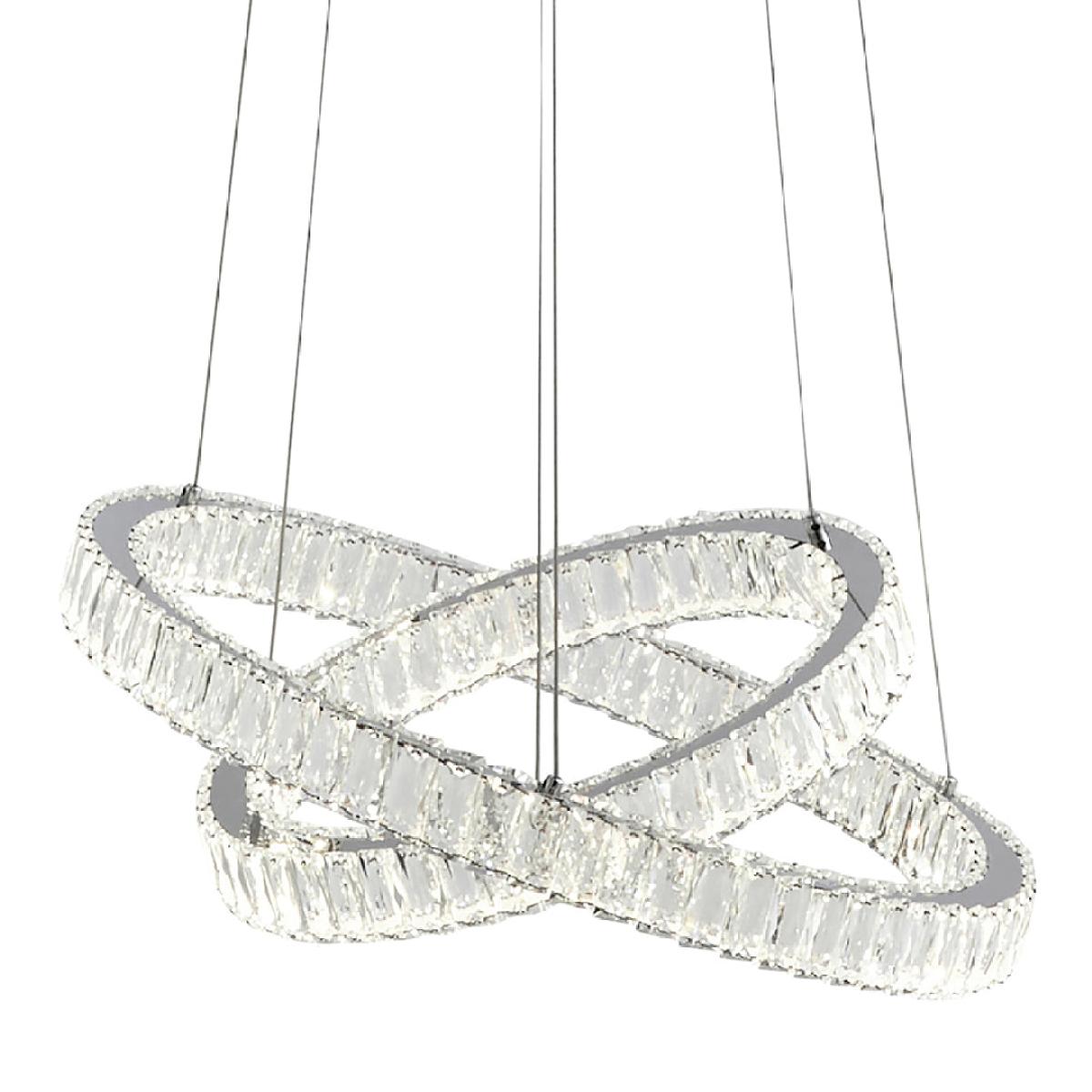 Enhance the beauty of your space with the Ausilia Polished Chrome Ceiling Light. This exquisite fitting features two crossed rings, each adorned with integrated LED lights and a stunning clear prism jeweled outer detail. Suspended from the chromed ceiling plate by fine silver wires, it creates a mesmerizing and elegant ambiance in any room. Enhance the beauty of your space with the Ausilia Polished Chrome Ceiling Light. This exquisite fitting features two crossed rings, each adorned with integrated LED lights and a stunning clear prism jeweled outer detail. Suspended from the chromed ceiling plate by fine silver wires, it creates a mesmerizing and elegant ambiance in any room.