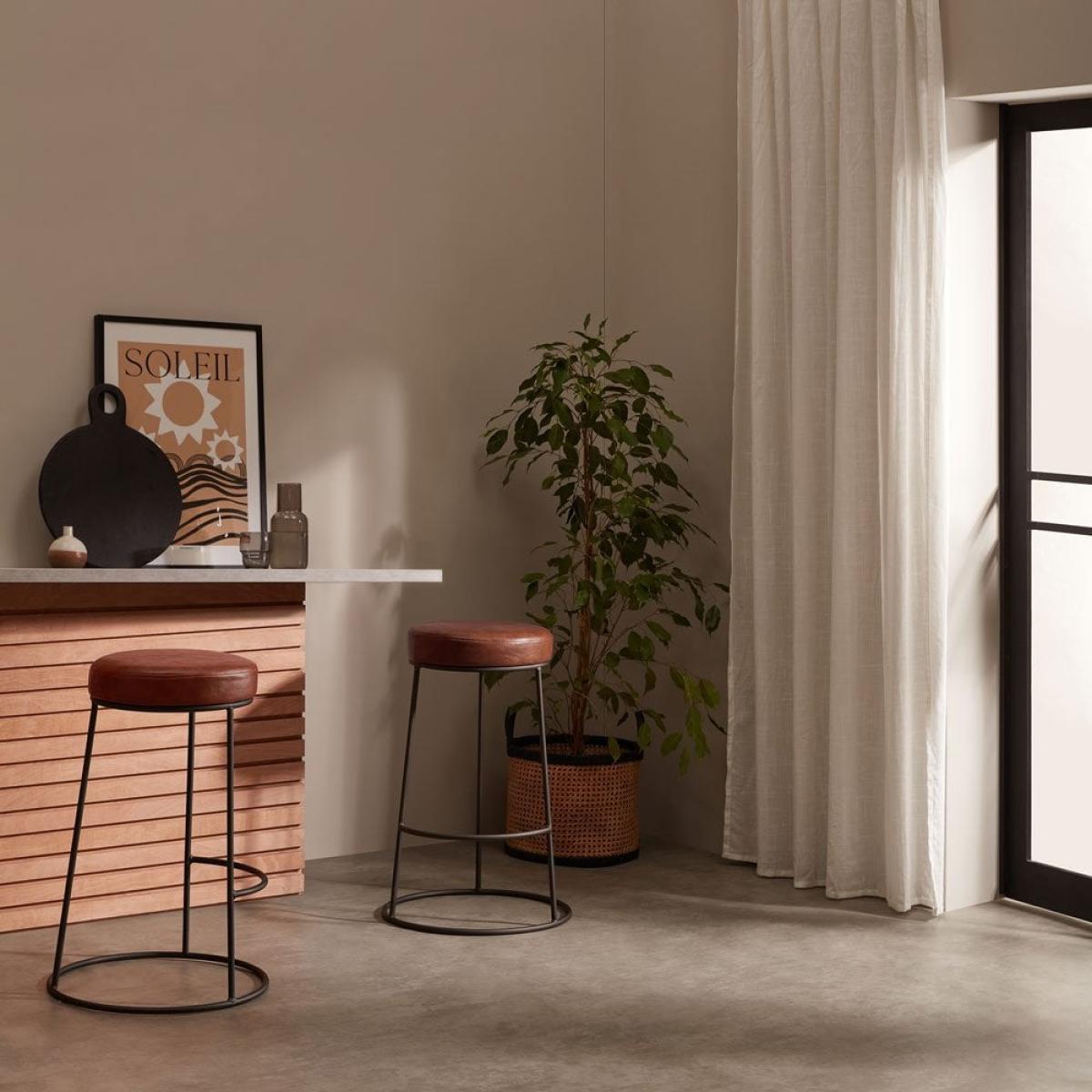 I really like how the Austen stool combines a warm tan seat with a clean, black metal frame - it brings just the right mix of rustic charm and modern minimalism. It sits comfortably in industrial-inspired kitchens, farmhouse spaces or pared-back Scandi interiors, and its slim profile means it won’t overwhelm a smaller island or breakfast bar. For styling, line up two or three at a kitchen peninsula and add a faux-sheepskin draped over one for a cosy touch. The neutral leather works well alongside timber countertops and simple, muted wall colours; introduce a few green plants or a matte-black pendant light to tie the look together.