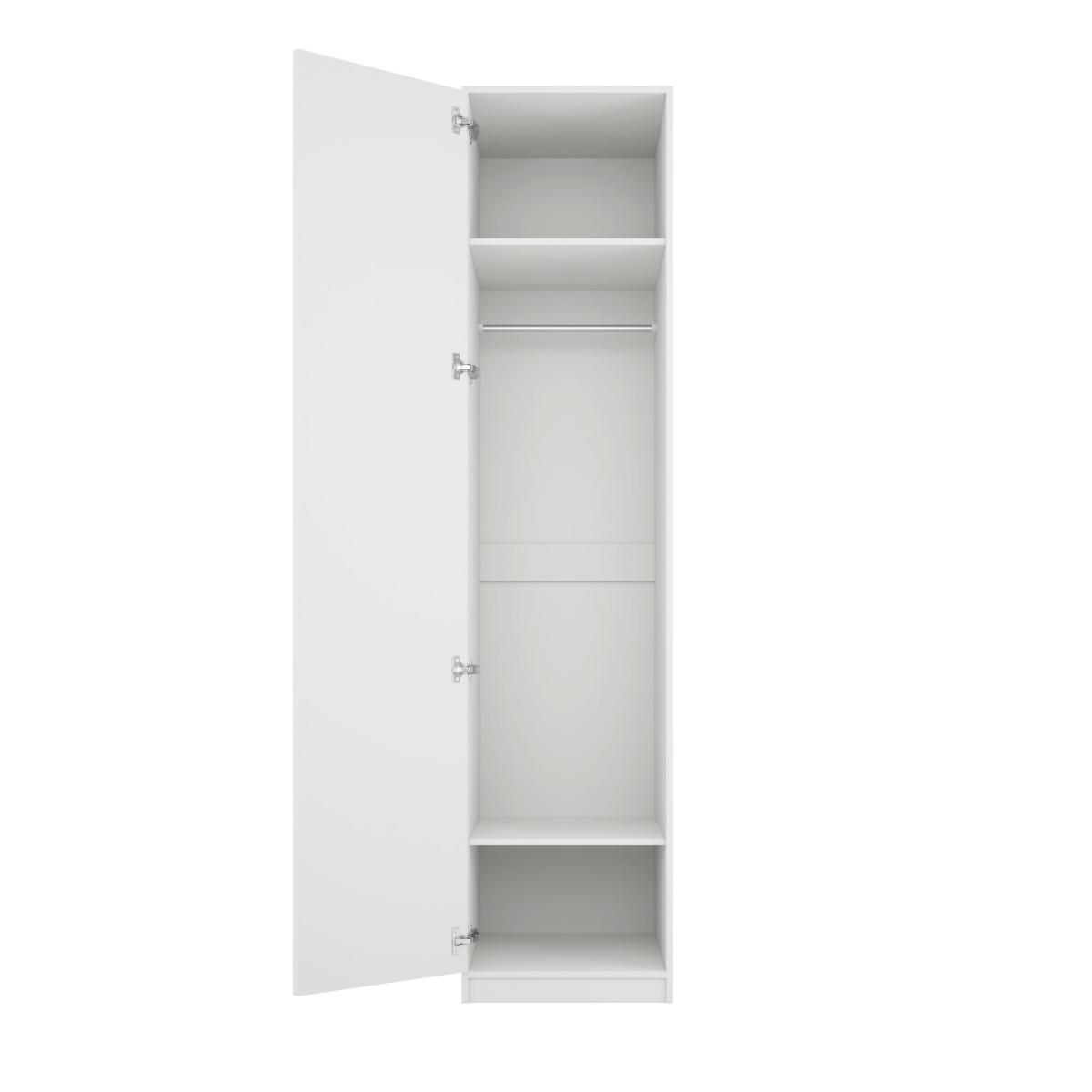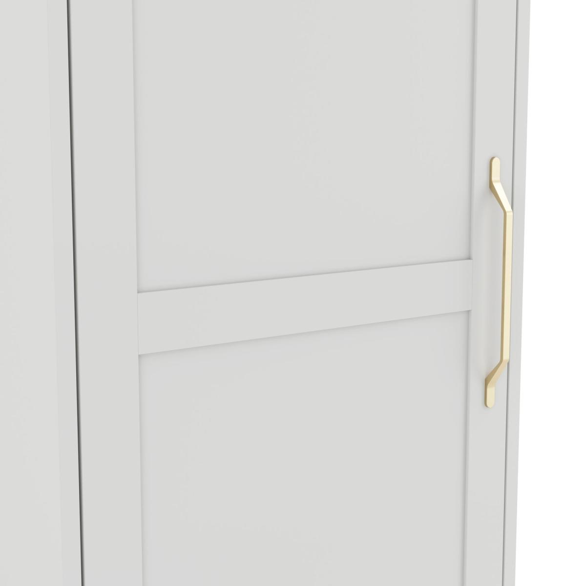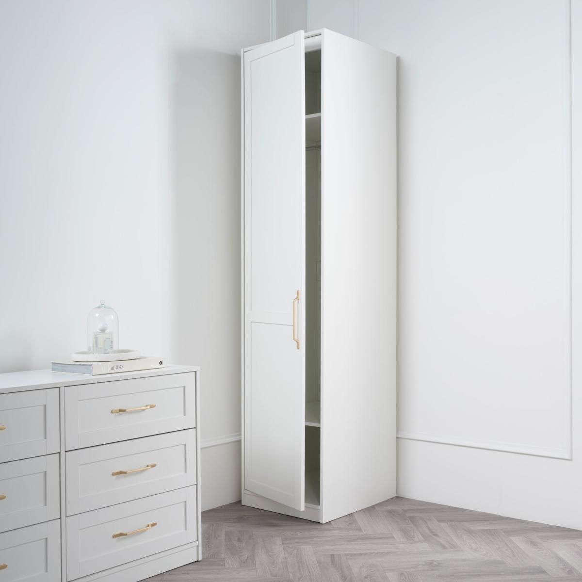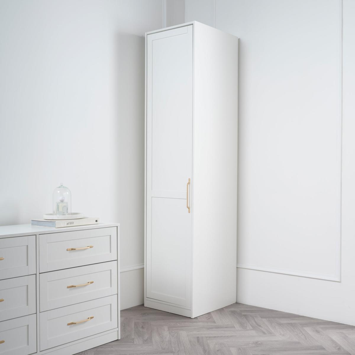 * Single wardrobe* Extra tall* Internal shelf* ‘Shaker’ style* Brushed brass handles Ideal for when space is in short supply, this single wardrobe will provide ample storage for all your items whilst lending style to the space. In a classic ‘shaker’ design and with a white finish and brass handles, this wardrobe is sure to suit all décor. Matching items are available for a seamless design throughout your room.