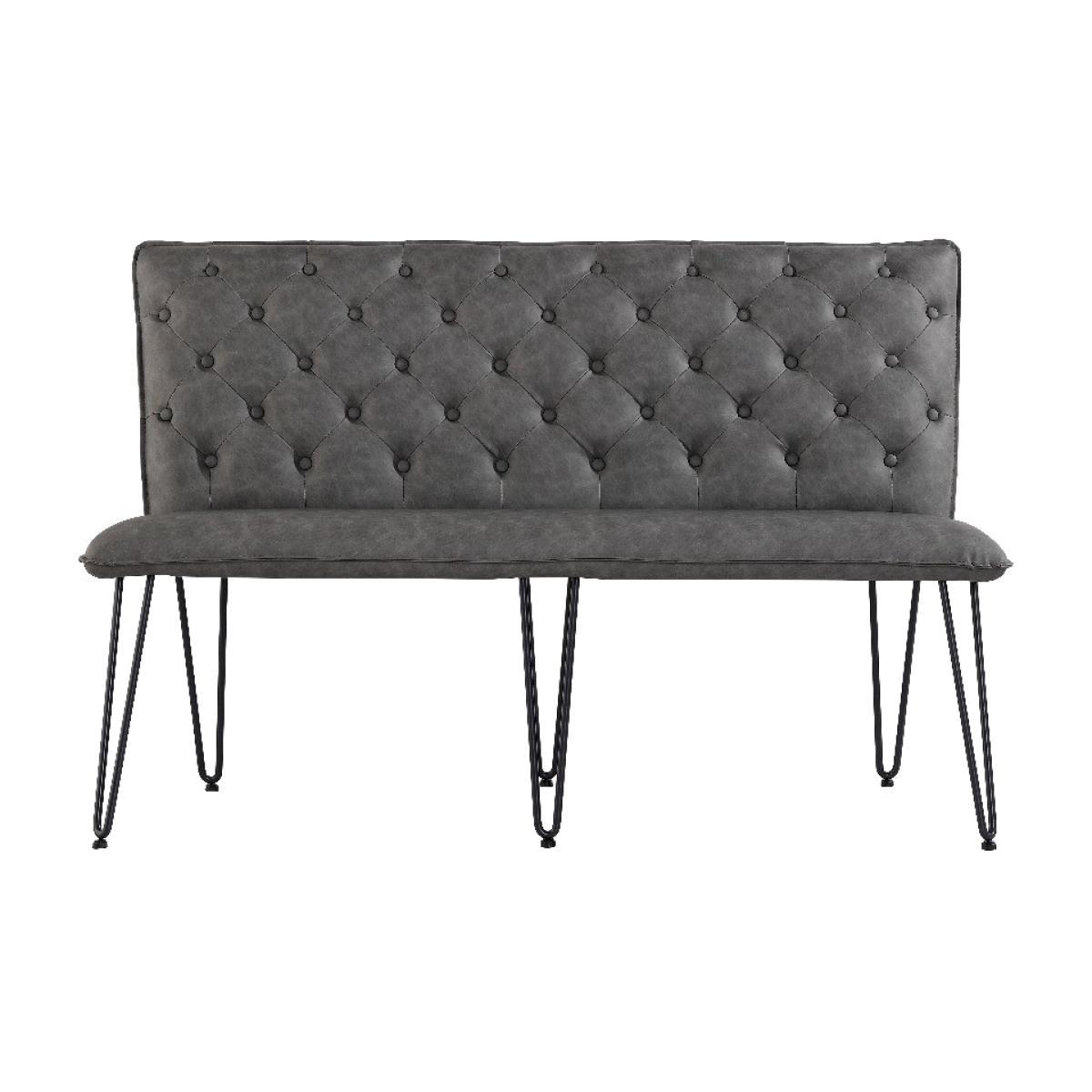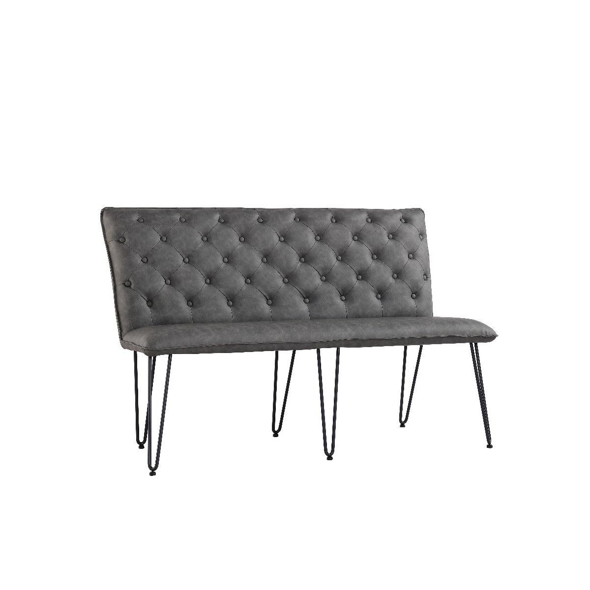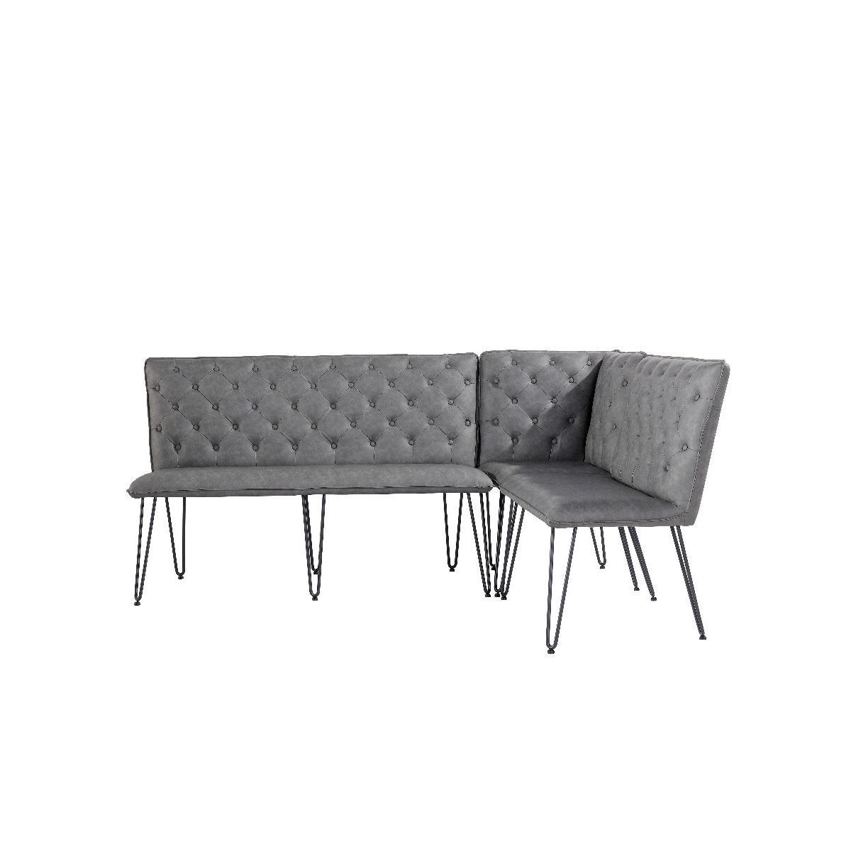 This is an exquisite bench with a striking design to uplift your home’s decor. This bench has a two-tone design, with smooth grey faux leather upholstery and hairpin legs with a sleek graphite finish. Beautiful grey faux leather upholstery with studded detailing. Tufted design for a retro look. Strong hairpin legs that offer support and stability. The seat height is 49 cm. Bolts to corner section to make a suite.