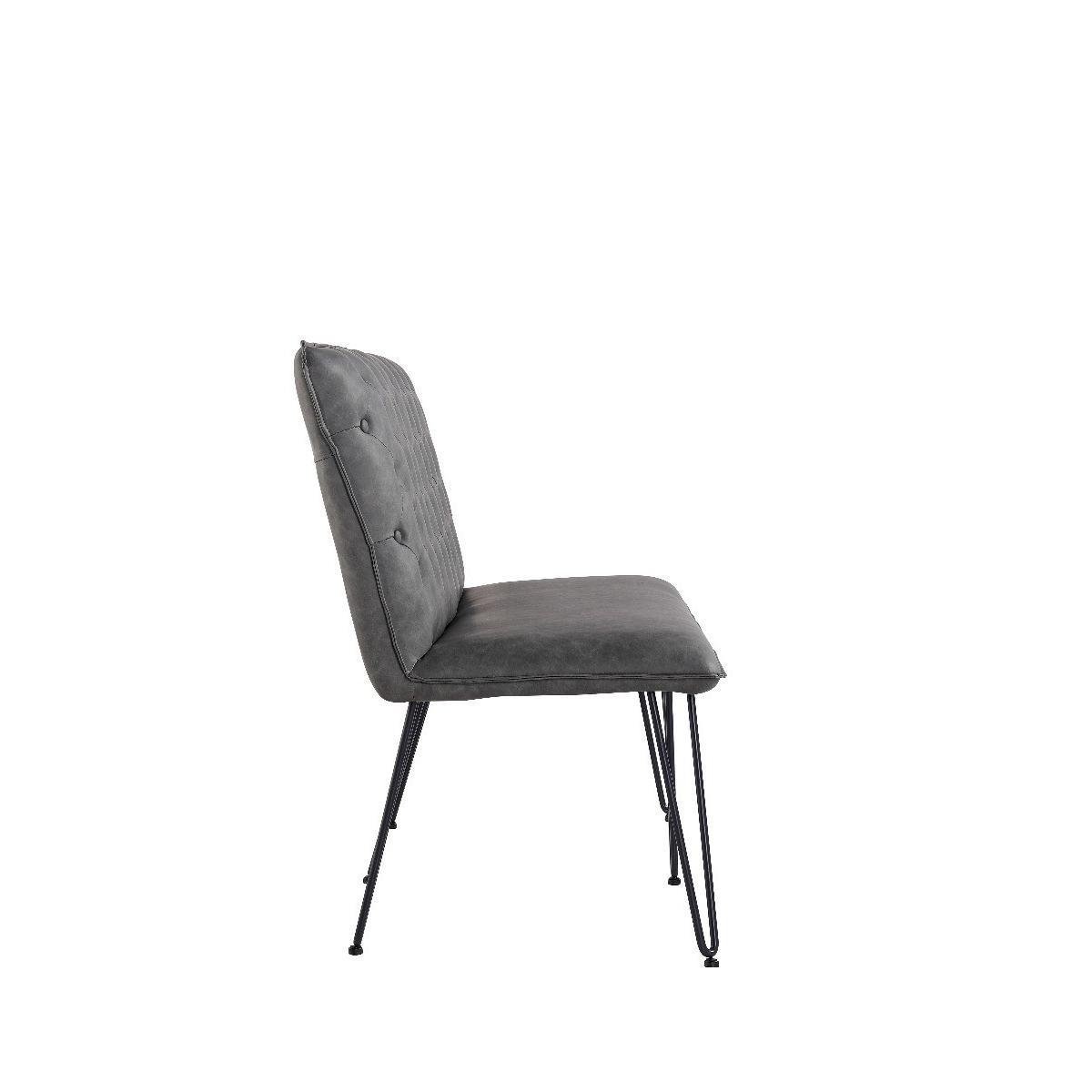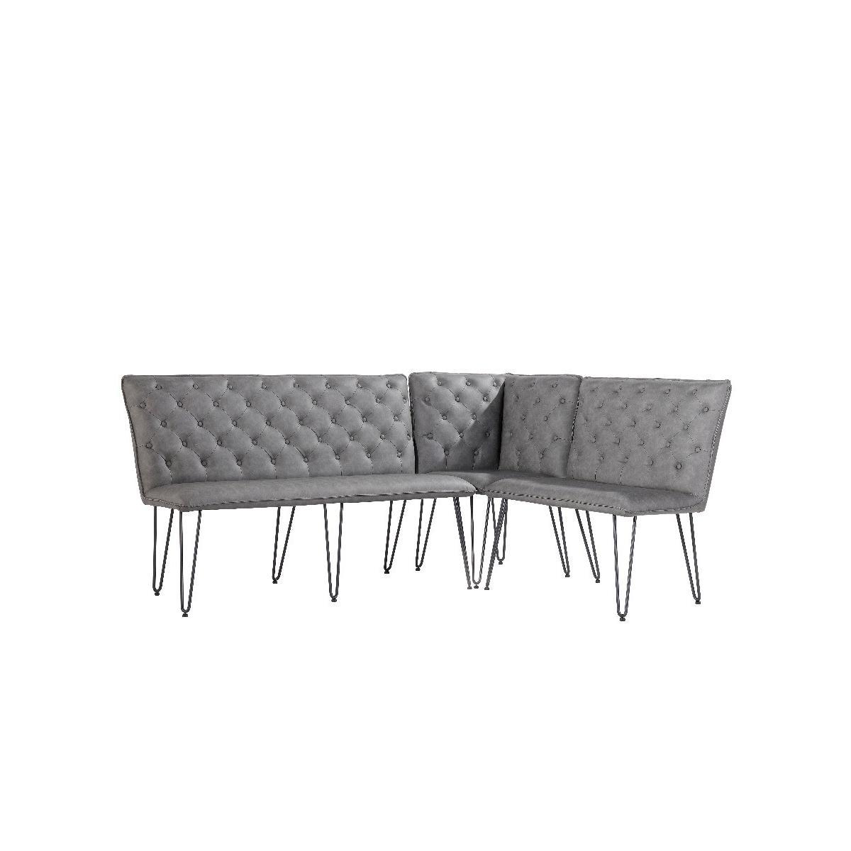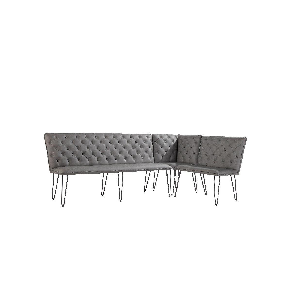 This is an exquisite bench with a striking design to uplift your home’s decor. This bench has a two-tone design, with smooth grey faux leather upholstery and hairpin legs with a sleek graphite finish. Beautiful grey faux leather upholstery with studded detailing. Tufted design for a retro look. Strong hairpin legs that offer support and stability. The seat height is 49 cm. Bolts to corner section to make a suite.