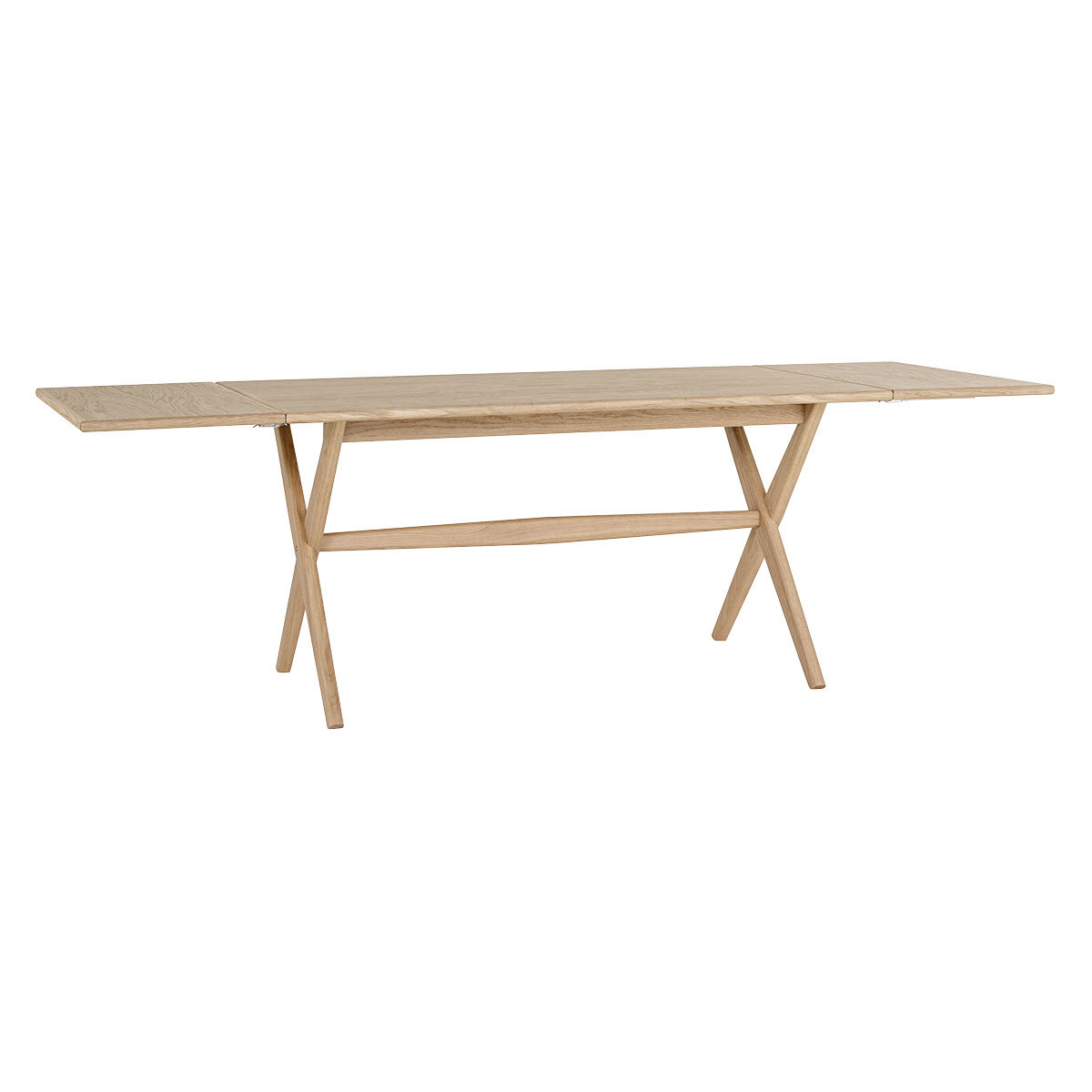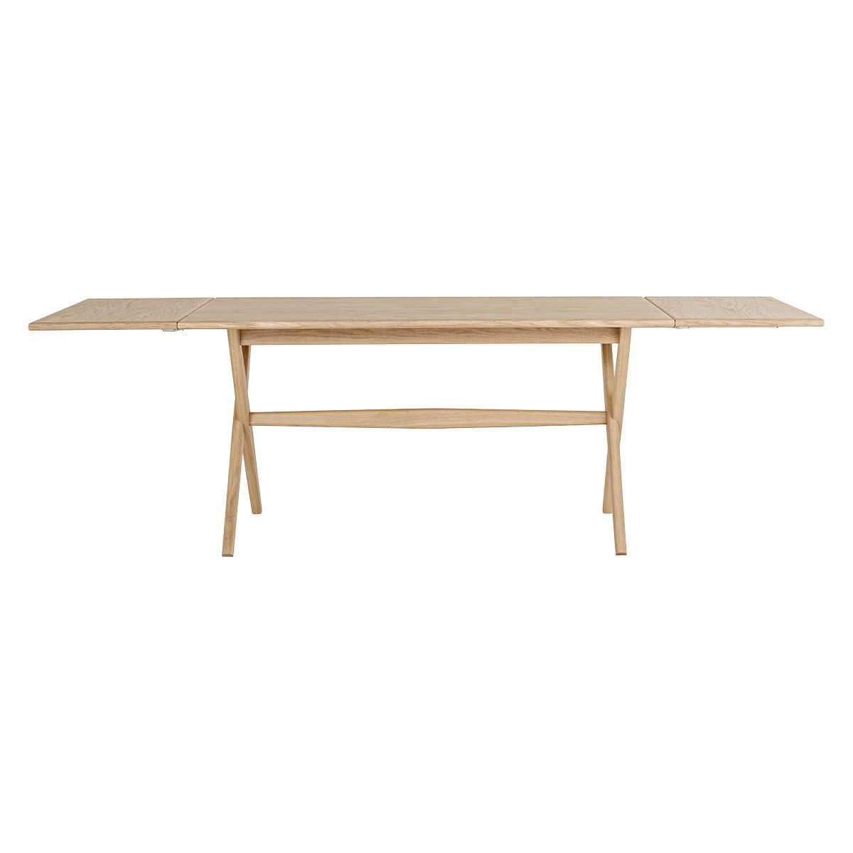 Clean, pure and elegant, the Austin oak extending dining table seats 4 people when closed and up to 10 when its two extending leaves are added. Inspired by classic Scandinavian designs, this table is made from solid and veneered oak and has a unique grain pattern that adds character to the design. Smooth, gently rounded edges add detail to the table’s cross frame and stretched bar and its neutral colour palette will complement any décor.