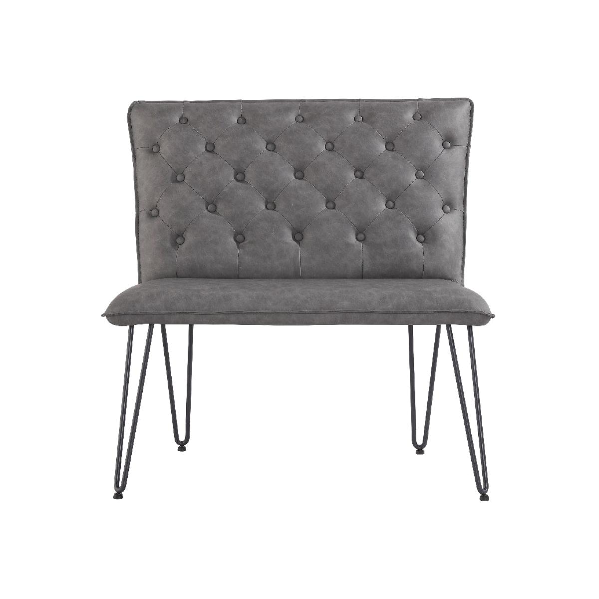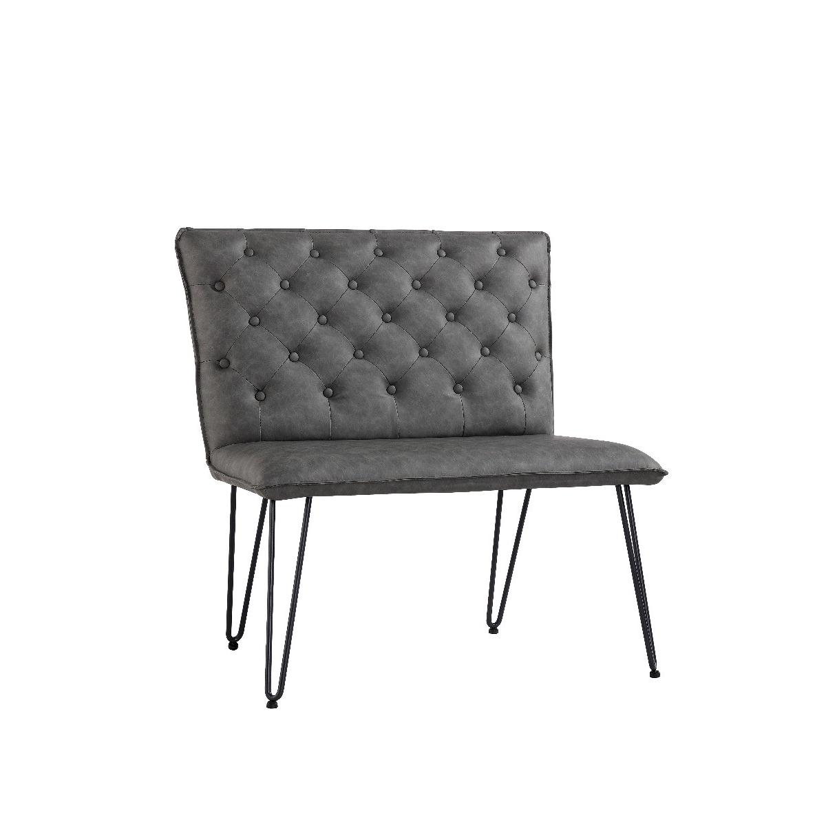 This is a chic upholstered bench with a stunning design to update any home. Carefully crafted with hairpin legs and a buttoned design for a striking look. Metal hairpin legs with a graphite finish for a retro-modern look. Grey faux leather with stud detailing to the back. Tufted upholstery for a touch of vintage style. Seat height of 49 cm. Bolts to corner section to make a suite.