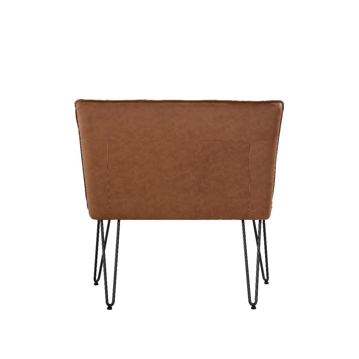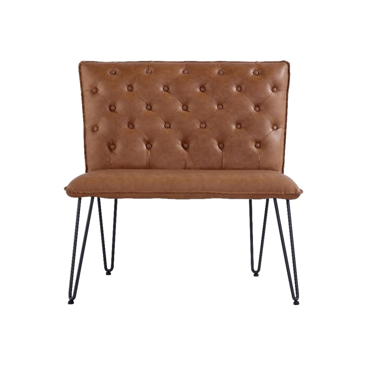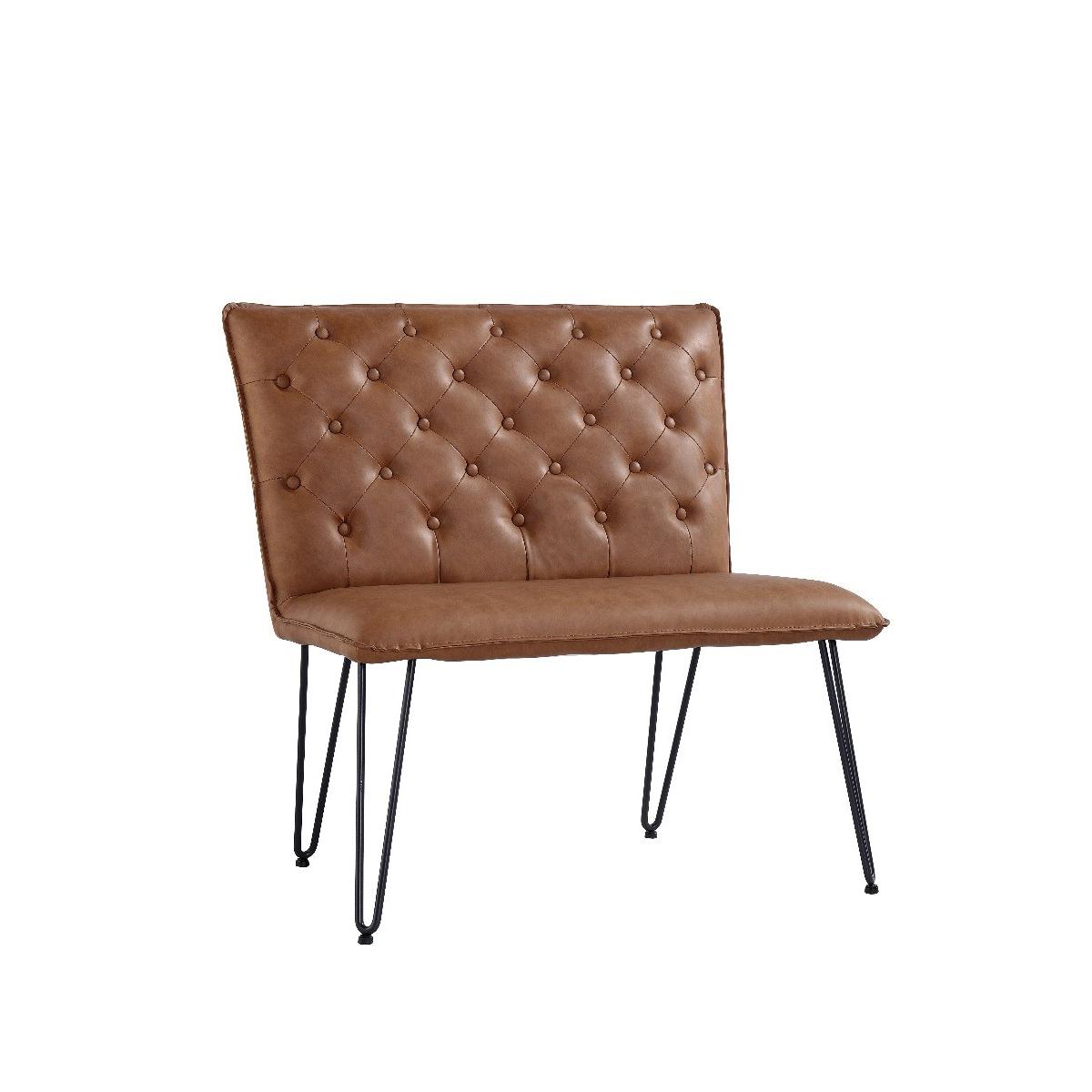 This stylish bench will be a stunning addition to your dining room or living room. This bench features a bold two-toned design that blends tan upholstery with graphite effect metal legs. Smooth tan faux leather upholstery with studded detailing to its back. Strong hairpin legs are sturdy and stylish. Tufted design for that retro look. The seat height is 49 cm. Bolts to corner section to make a suite.