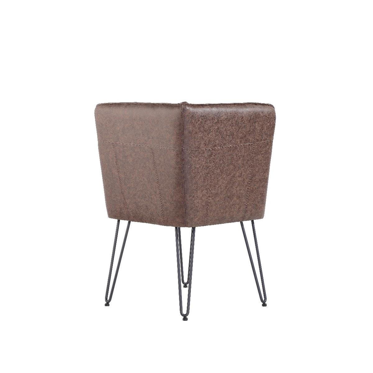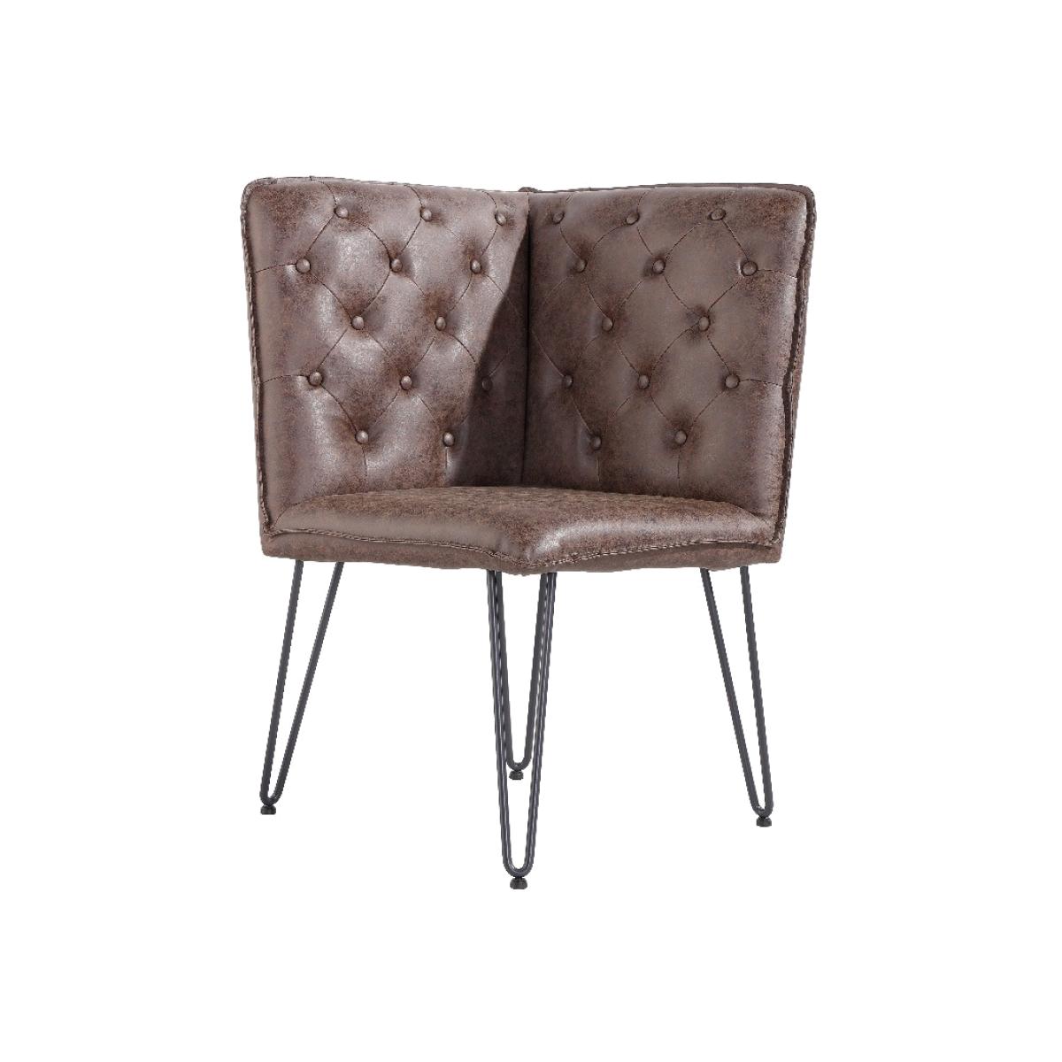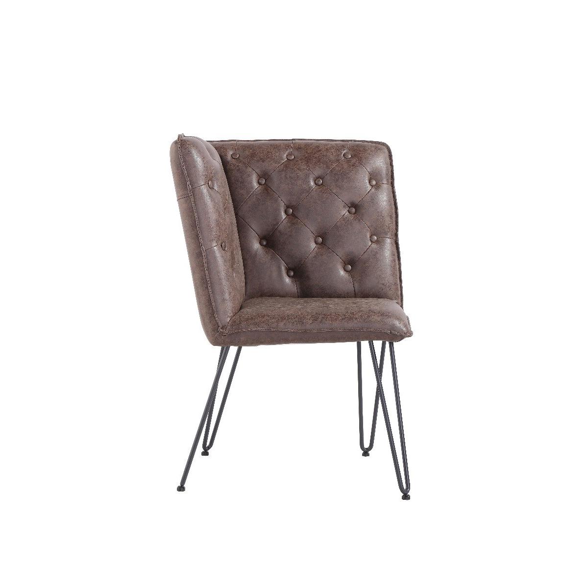 This stylish bench has a strong frame and elegant two-toned design that combines brown faux leather and graphite metal. This small bench is made to tuck neatly into corners, perfect for homes with limited space. Strong hairpin legs that offer firm support. Anti-slip feet pads for stability and floor protection. Sleek brown faux leather upholstery with button back detailing. Bolts to corner section to make a suite.