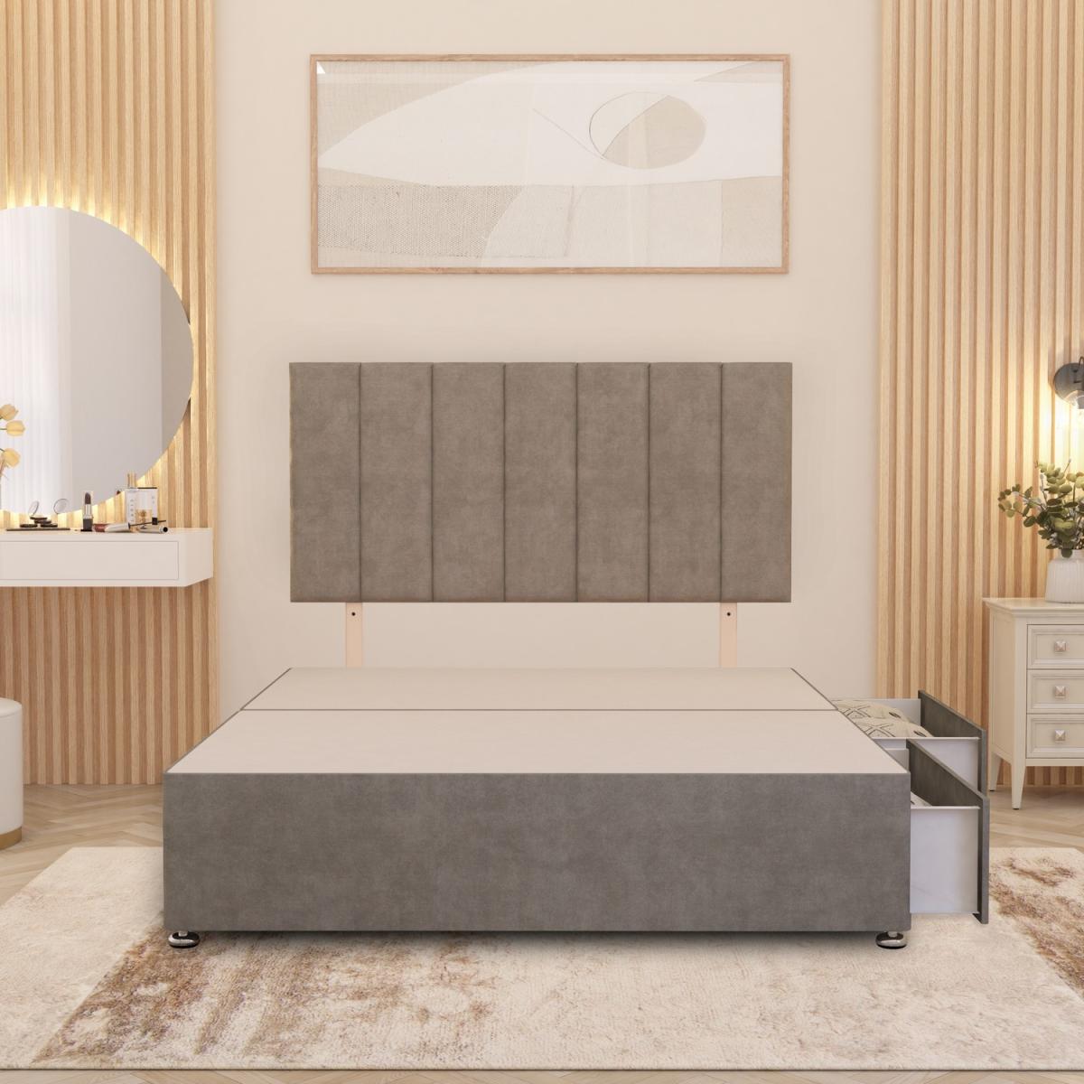 The Austin Divan Bed Base with Upholstered Headboard combines classic style with lasting support. Its solid platform top offers a firm, stable surface to enhance your mattress performance and comfort. Crafted from quality timber and finished in plush velvet, it brings a refined touch to any bedroom. The matching headboard features soft, cushioned panels, perfect for sitting up in bed and adding a statement of luxury and comfort. Base Height 34.5cm with gliders attached. Headboard face is 32" and adjustable overall height depending on strut placement. 2FT. 6 Small Single W 79 cm x L 193 cm, 3FT Single W 92 cm x L 193 cm, 4FT Small Double W 123 cm x L 193 cm, 4FT. 6 Double W 137 cm x L 193 cm, 5FT King W 153 cm x L 203 cm, 6FT Super King W 183 cm x L 203 cm An excellent space saving storage bed. Drawers can be placed left or right side as the headboard fits either end of the base.