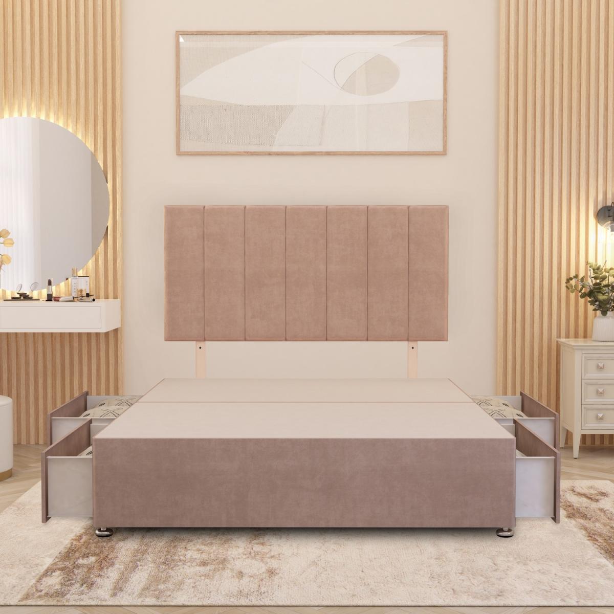 The Austin Divan Bed Base with Upholstered Headboard combines classic style with lasting support. Its solid platform top offers a firm, stable surface to enhance your mattress performance and comfort. Crafted from quality timber and finished in plush velvet, it brings a refined touch to any bedroom. The matching headboard features soft, cushioned panels, perfect for sitting up in bed and adding a statement of luxury and comfort. Base Height 34.5cm with gliders attached. Headboard face is 32" and adjustable overall height depending on strut placement. 2FT. 6 Small Single W 79 cm x L 193 cm, 3FT Single W 92 cm x L 193 cm, 4FT Small Double W 123 cm x L 193 cm, 4FT. 6 Double W 137 cm x L 193 cm, 5FT King W 153 cm x L 203 cm, 6FT Super King W 183 cm x L 203 cm Maximum storage capacity with 4 drawers, 2 on each side make this a great storage bed option.