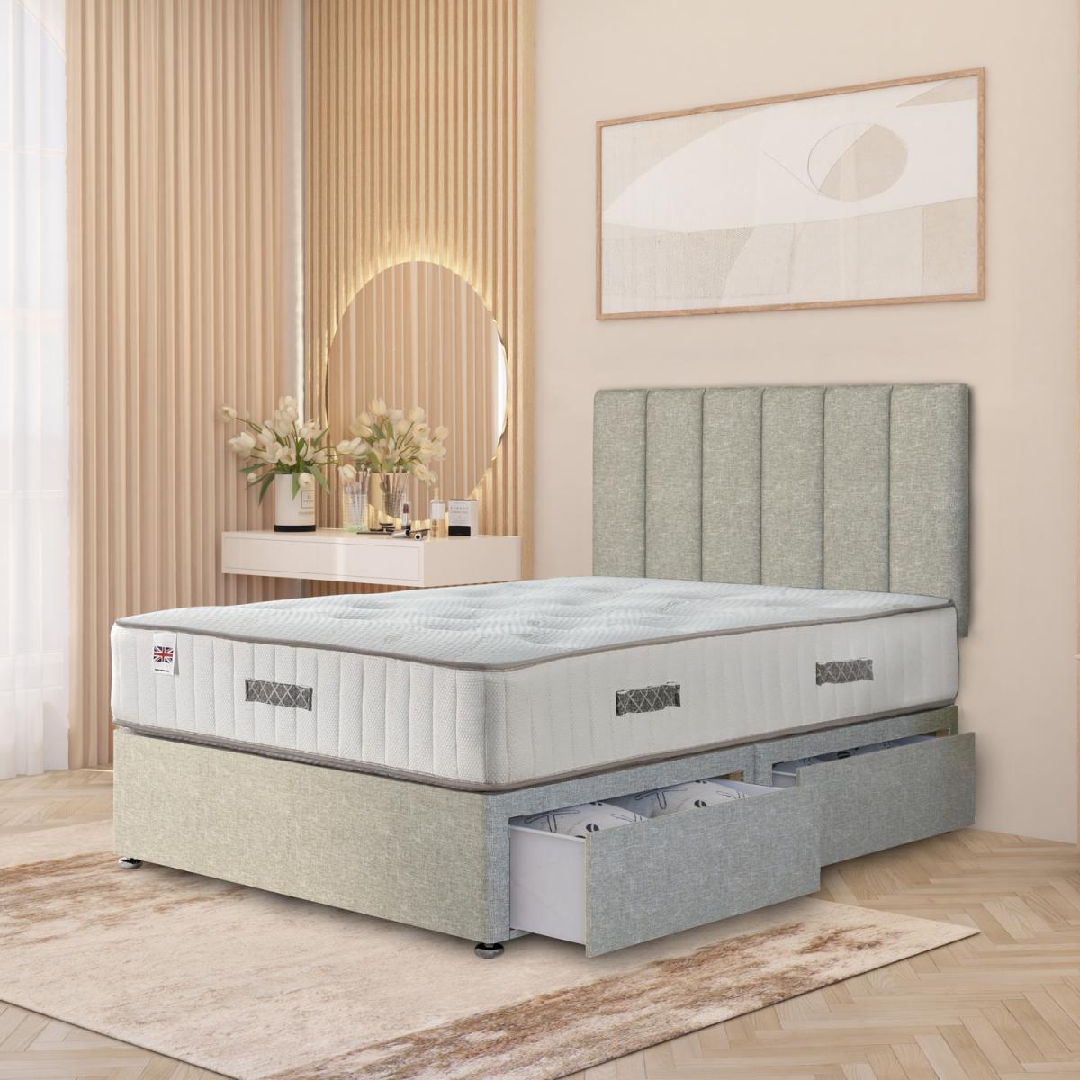 The Austin Divan Bed Set in Linen Fabric combines timeless style with lasting comfort. Built with a solid platform top divan base, it offers strength, durability, and the ideal surface to enhance mattress performance. Complete with a tall 32" upholstered headboard and a 28cm deep Hybrid Midnight Orthopaedic Pocket Spring Mattress, this set delivers exceptional support. The mattress uses individually nested pocket springs that respond to your body for personalised comfort, each reacting independently to weight for tailored support, reducing partner disturbance. The 7-zone support system eases pressure on shoulders, hips, and back, and layers of luxury foams provide contouring comfort and bounce-back support. The breathable core helps regulate temperature, and the soft-touch cashmere fabric with hand tufting ensures a durable, supportive sleep surface. Finished with cushioned vertical panels, the elegant headboard makes this divan bed the perfect bedroom upgrade, base and headboard finished in Linen Fabric for a textured look. Available in all UK sizes 2FT. 6 Small Single (79x193cm), 3FT Single (92x193cm), 4FT Small Double (123x193cm), 4FT. 6 Double (137x193cm), 5FT King (153x203cm), 6FT Super King (183x203cm). This bed comes with 2 easy access storage drawers. Headboard can be placed in either end of the base, so you can either have both drawers facing on the right side, or left side.