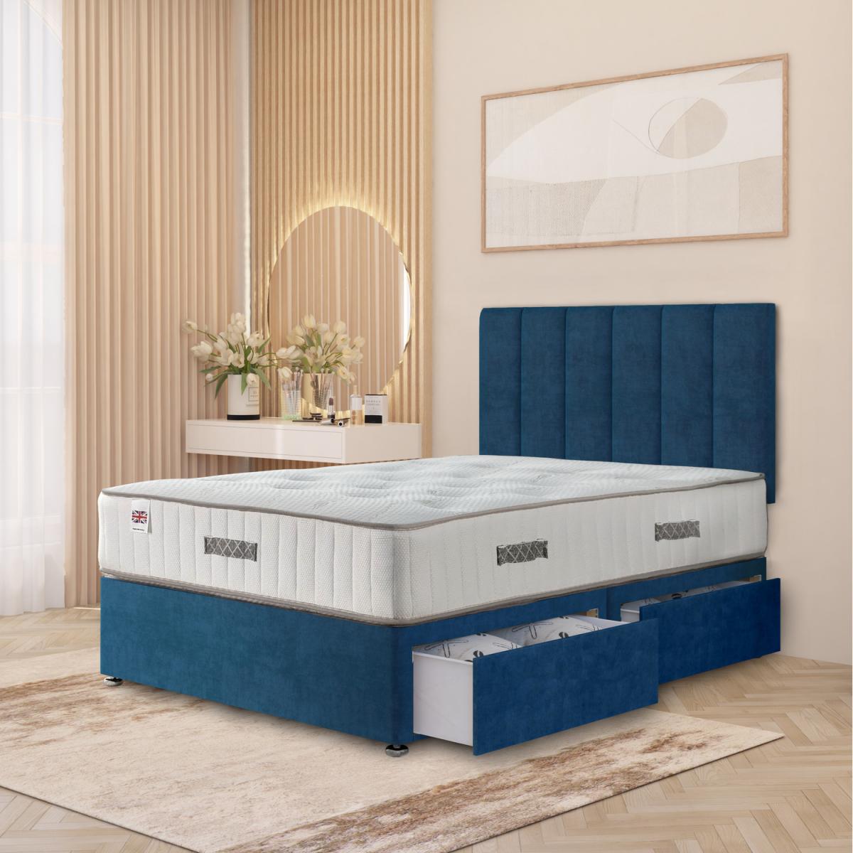 The luxurious Austin Divan Bed Set comes with 32" Upholstered Headboard and Hybrid Midnight Pocket Spring Mattress. The Midnight Orthopaedic mattress offers extra support while relieving pressure, made from a high count of individually nested pocket springs which adjust to your body while you sleep, offering individual 7-zone tailored support to relieve pressure from key areas of the body throughout the night. The added layers of luxury fillings offer sublime comfort and support and ensure a breathable mattress core to help regulate temperature. Finished in a soft touch knitted cashmere fabric and expertly hand tufted to create a more desirable sleeping surface that contours to your body. Transform your bedroom with the stunning Austin upholstered headboard that has cushioned panels which offer support right across when sitting up in bed. This bed comes with 2 easy access storage drawers. Headboard can be placed in either end of the base, so you can either have both drawers facing on the right side, or left side.
