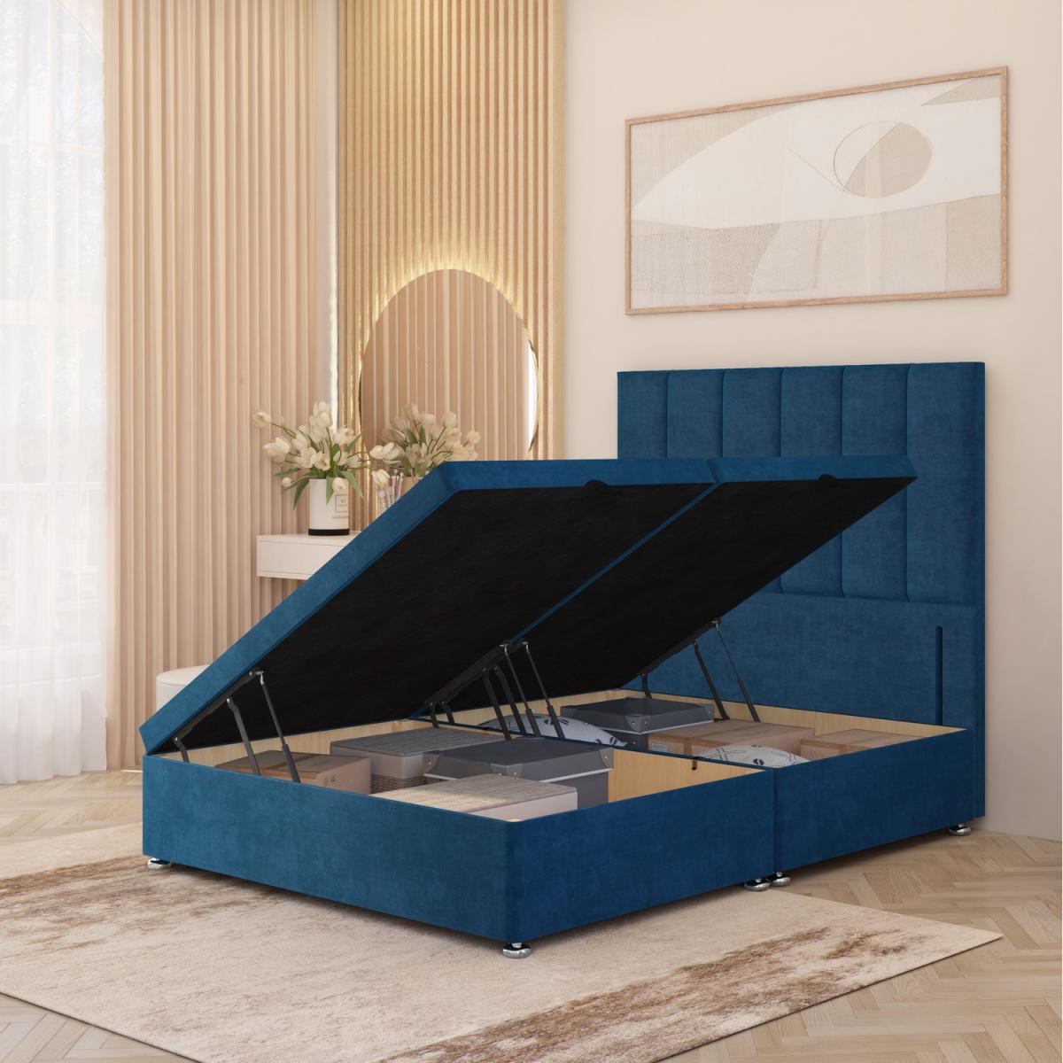 The Austin Plush Velvet Side Opening Ottoman Divan Storage Bed Base with 54" Floor Standing Upholstered Headboard combines timeless style with lasting support. Mattress not included. Exclusively manufactured in the UK. Featuring a solid, non-slip platform base. A solid top base provides a firm, stable surface for your mattress, eliminating the bouncy feel and poor edge support often experienced with slatted bases, allowing your mattress to benefit you to its full potential. The base comes with solid wood throughout the inside of the storage compartments, offering a luxurious look when opened, with a wooden floor also so your storage isn't just sitting on your floor. The matching headboard is crafted with soft, cushioned vertical panels, with hand finished upholstery for stunning appeal as well as comfort when sitting up in bed. Base Height 34.5cm or 37.5cm with gliders attached (base can be used with or without gliders). Internal storage dimensions vary by bed size, typically 4-6cm smaller in length and width than the total bed size. All ottoman beds provide 24cm of discreet under bed storage, easily accessed with smooth, gas-assisted side-lift pistons (600N800. N depending on size). Perfect for modern spaces, this Ottoman bed is expertly made by our skilled craftsmen in the UK and meets all UK safety and quality standards. 2FT. 6 and 3FT ottomans arrive as one base piece, and have one storage compartment, 4FT and above arrive as 2 pieces and thus have two separate storage spaces. Total headboard height from the floor is 54" / 137cm, the front panel of the headboard is 34" / 86cm. 4FT. 6 Ottoman Bed, L 193cm x W 137cm
