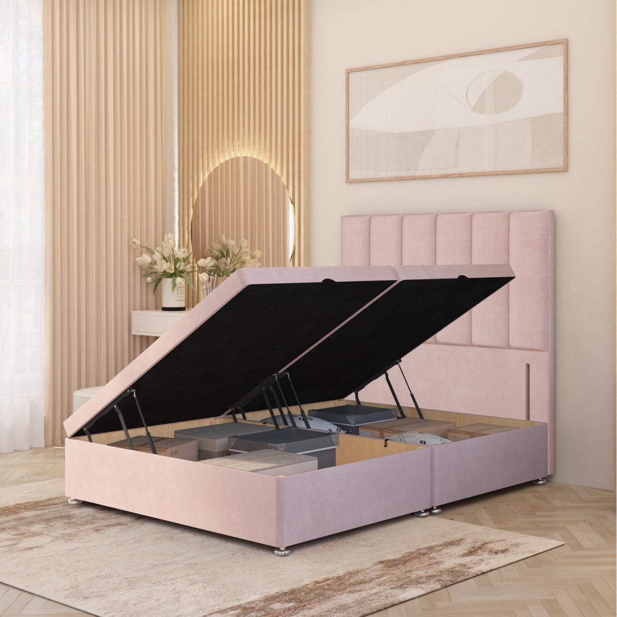 The Austin Plush Velvet Side Opening Ottoman Divan Storage Bed Base with 54" Floor Standing Upholstered Headboard combines timeless style with lasting support. Mattress not included. Exclusively manufactured in the UK. Featuring a solid, non-slip platform base. A solid top base provides a firm, stable surface for your mattress, eliminating the bouncy feel and poor edge support often experienced with slatted bases, allowing your mattress to benefit you to its full potential. The base comes with solid wood throughout the inside of the storage compartments, offering a luxurious look when opened, with a wooden floor also so your storage isn't just sitting on your floor. The matching headboard is crafted with soft, cushioned vertical panels, with hand finished upholstery for stunning appeal as well as comfort when sitting up in bed. Base Height 34.5cm or 37.5cm with gliders attached (base can be used with or without gliders). Internal storage dimensions vary by bed size, typically 4-6cm smaller in length and width than the total bed size. All ottoman beds provide 24cm of discreet under bed storage, easily accessed with smooth, gas-assisted side-lift pistons (600N800. N depending on size). Perfect for modern spaces, this Ottoman bed is expertly made by our skilled craftsmen in the UK and meets all UK safety and quality standards. 2FT. 6 and 3FT ottomans arrive as one base piece, and have one storage compartment, 4FT and above arrive as 2 pieces and thus have two separate storage spaces. Total headboard height from the floor is 54" / 137cm, the front panel of the headboard is 34" / 86cm. 5FT Ottoman Bed, L 203cm x W 153cm