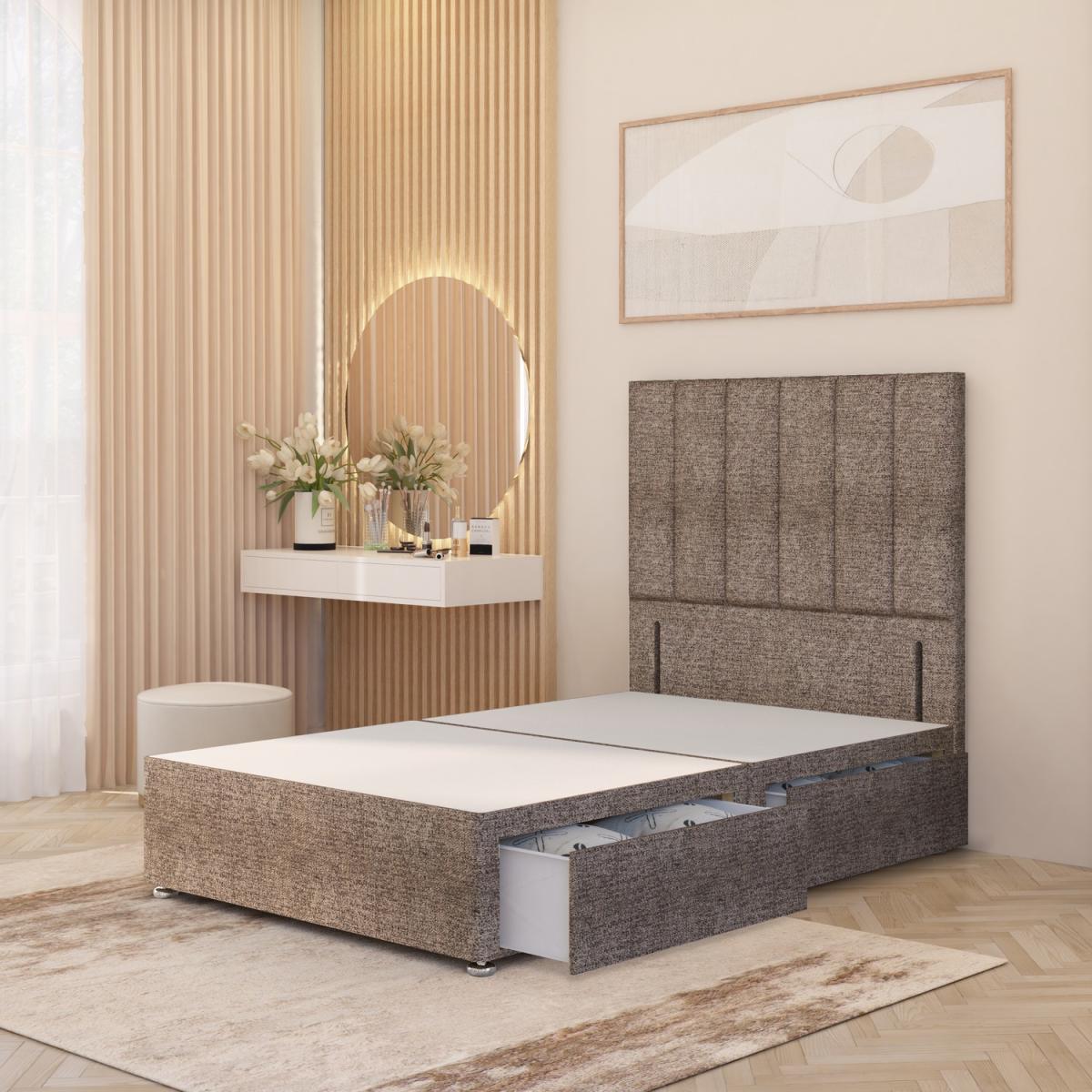 The Austin Tweed Fabric Divan Bed Base with Floor Standing Upholstered Headboard combines luxury design with durable everyday support. The solid platform top divan base provides a stable, firm foundation for your mattress, enhancing comfort and delivering superior all round support compared to slatted frames. Expertly crafted in the UK from quality timber and upholstered in luxurious tweed fabric, this bed set adds refined elegance to both classic and modern interiors. The floor standing upholstered headboard features vertical panel cushioning, offering a contemporary look that doubles as a comfortable backrest for sitting up in bed. The divan base measures 34.5cm in height with gliders attached (30.5cm without gliders) and is available in all standard UK sizes 2FT. 6 Small Single, 3FT Single, 4FT Small Double, 4FT. 6 Double, 5FT King, and 6FT Super King. For added practicality, choose from multiple storage drawer options including No Drawers, 2 Drawers (same side), or 4 Drawers, making this velvet divan bed with headboard both stylish and functional. Headboard height is 54"137cm, the face panel height is 32"86cm. This 2 Draw Bed Base comes with easy access storage drawers. Headboards can be attached on either end of the base.