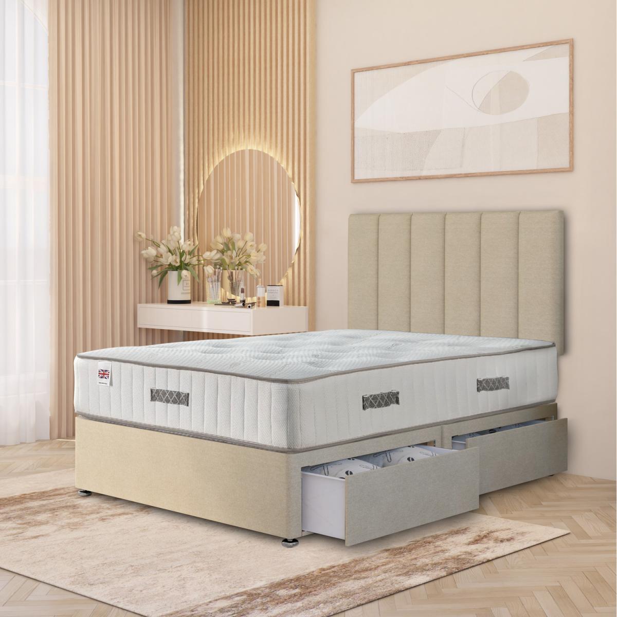 The Austin Divan Bed Set in Tweed Fabric combines timeless style with lasting comfort. Built with a solid platform top divan base, it offers strength, durability, and the ideal surface to enhance mattress performance. Complete with a 32" upholstered headboard and a 28cm deep Hybrid Midnight Orthopaedic Pocket Spring Mattress, this set delivers exceptional support. The mattress uses individually nested pocket springs that respond to your body for personalised comfort, each reacting independently to weight for tailored support, reducing partner disturbance. The 7-zone support system eases pressure on shoulders, hips, and back, and layers of luxury foams provide contouring comfort and bounce-back support. The breathable core helps regulate temperature, and the soft-touch cashmere fabric with hand tufting ensures a durable, supportive sleep surface. Finished with cushioned vertical panels, the elegant headboard makes this divan bed the perfect bedroom upgrade, base and headboard finished in Tweed Fabric for a textured look. This bed comes with 2 easy access storage drawers. Headboard can be placed in either end of the base, so you can either have both drawers facing on the right side, or left side.