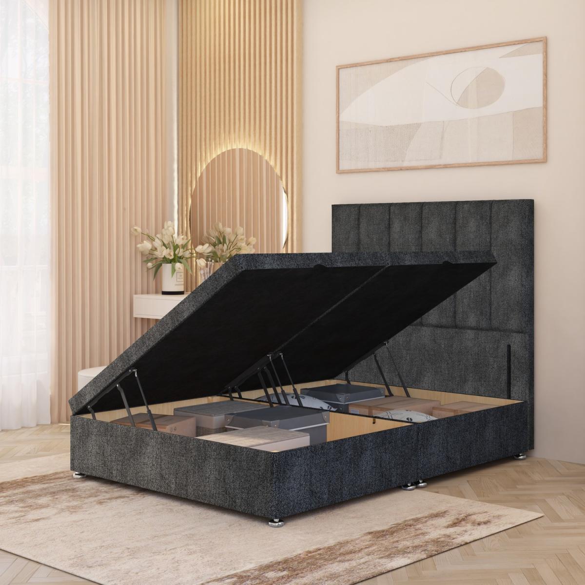 The Austin Tweed Fabric Side Opening Ottoman Divan Storage Bed Base with 54" Floor Standing Upholstered Headboard combines timeless style with lasting support. Mattress not included. Exclusively manufactured in the UK. Featuring a solid, non-slip platform base. A solid top base provides a firm, stable surface for your mattress, eliminating the bouncy feel and poor edge support often experienced with slatted bases, allowing your mattress to benefit you to its full potential. The base comes with solid wood throughout the inside of the storage compartments, offering a luxurious look when opened, with a wooden floor also so your storage isn't just sitting on your floor. The matching headboard is crafted with soft, cushioned vertical panels, with hand finished upholstery for stunning appeal as well as comfort when sitting up in bed. Base Height 34.5cm or 37.5cm with gliders attached (base can be used with or without gliders). Internal storage dimensions vary by bed size, typically 4-6cm smaller in length and width than the total bed size. All ottoman beds provide 24cm of discreet under bed storage, easily accessed with smooth, gas-assisted side-lift pistons (600N/800 N depending on size). Perfect for modern spaces, this Ottoman bed is expertly made by our skilled craftsmen in the UK and meets all UK safety and quality standards. 2FT. 6 and 3FT ottomans arrive as one base piece, and have one storage compartment, 4FT and above arrive as 2 pieces and thus have two separate storage spaces. Total headboard height from the floor is 54" / 137cm, the front panel of the headboard is 34" / 86cm. 4FT. 6 Ottoman Bed, L 193cm x W 137cm