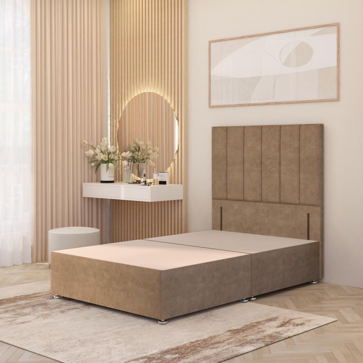 The Austin Plush Velvet Divan Bed Base with Floor Standing Upholstered Headboard combines luxury design with durable everyday support. The solid platform top divan base provides a stable, firm foundation for your mattress, enhancing comfort and delivering superior all round support compared to slatted frames. Expertly crafted in the UK from quality timber and upholstered in luxurious plush velvet fabric, this bed set adds refined elegance to both classic and modern interiors. The floor standing upholstered headboard features vertical panel cushioning, offering a contemporary look that doubles as a comfortable backrest for sitting up in bed. The divan base measures 34.5cm in height with gliders attached (30.5cm without gliders) and is available in all standard UK sizes 2FT. 6 Small Single, 3FT Single, 4FT Small Double, 4FT. 6 Double, 5FT King, and 6FT Super King. For added practicality, choose from multiple storage drawer options including No Drawers, 2 Drawers (same side), or 4 Drawers, making this velvet divan bed with headboard both stylish and functional. Headboard height is 54" 137cm, the face panel height is 32" 86cm.