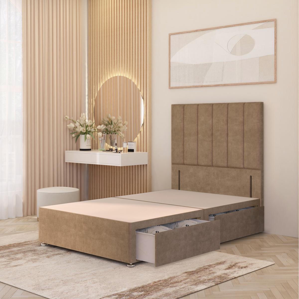 The Austin Plush Velvet Divan Bed Base with Floor Standing Upholstered Headboard combines luxury design with durable everyday support. The solid platform top divan base provides a stable, firm foundation for your mattress, enhancing comfort and delivering superior all round support compared to slatted frames. Expertly crafted in the UK from quality timber and upholstered in luxurious plush velvet fabric, this bed set adds refined elegance to both classic and modern interiors. The floor standing upholstered headboard features vertical panel cushioning, offering a contemporary look that doubles as a comfortable backrest for sitting up in bed. The divan base measures 34.5cm in height with gliders attached (30.5cm without gliders) and is available in all standard UK sizes 2FT. 6 Small Single, 3FT Single, 4FT Small Double, 4FT. 6 Double, 5FT King, and 6FT Super King. For added practicality, choose from multiple storage drawer options including No Drawers, 2 Drawers (same side), or 4 Drawers, making this velvet divan bed with headboard both stylish and functional. Headboard height is 54" 137cm, the face panel height is 32" 86cm. An excellent space saving storage bed. Drawers can be placed left or right side as the headboard fits either end of the base.