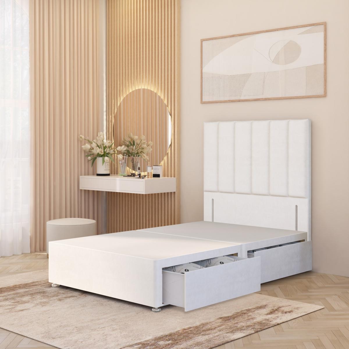 The Austin Plush Velvet Divan Bed Base with Floor Standing Upholstered Headboard combines luxury design with durable everyday support. The solid platform top divan base provides a stable, firm foundation for your mattress, enhancing comfort and delivering superior all round support compared to slatted frames. Expertly crafted in the UK from quality timber and upholstered in luxurious plush velvet fabric, this bed set adds refined elegance to both classic and modern interiors. The floor standing upholstered headboard features vertical panel cushioning, offering a contemporary look that doubles as a comfortable backrest for sitting up in bed. The divan base measures 34.5cm in height with gliders attached (30.5cm without gliders) and is available in all standard UK sizes 2FT. 6 Small Single, 3FT Single, 4FT Small Double, 4FT. 6 Double, 5FT King, and 6FT Super King. For added practicality, choose from multiple storage drawer options including No Drawers, 2 Drawers (same side), or 4 Drawers, making this velvet divan bed with headboard both stylish and functional. Headboard height is 54" 137cm, the face panel height is 32" 86cm. An excellent space saving storage bed. Drawers can be placed left or right side as the headboard fits either end of the base.