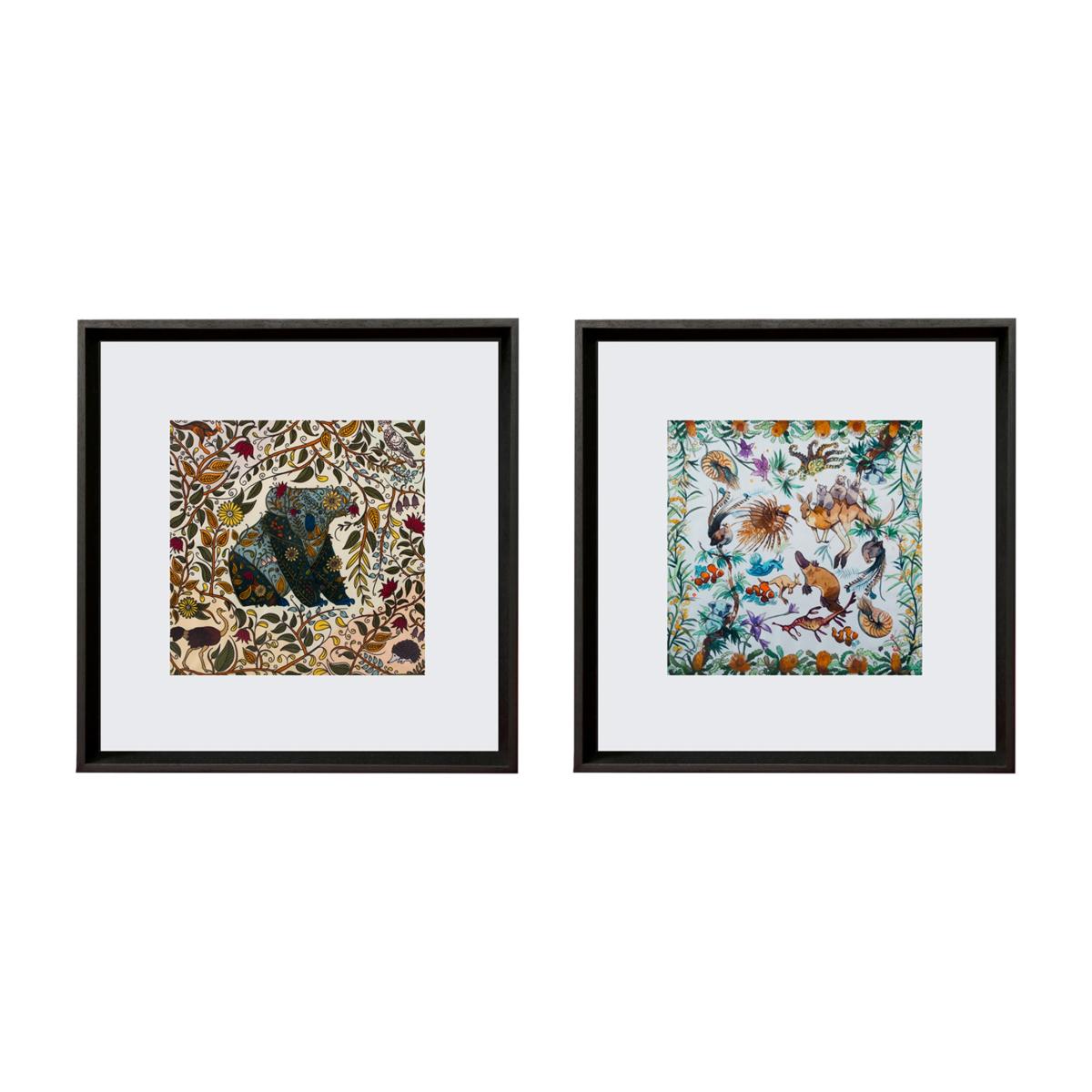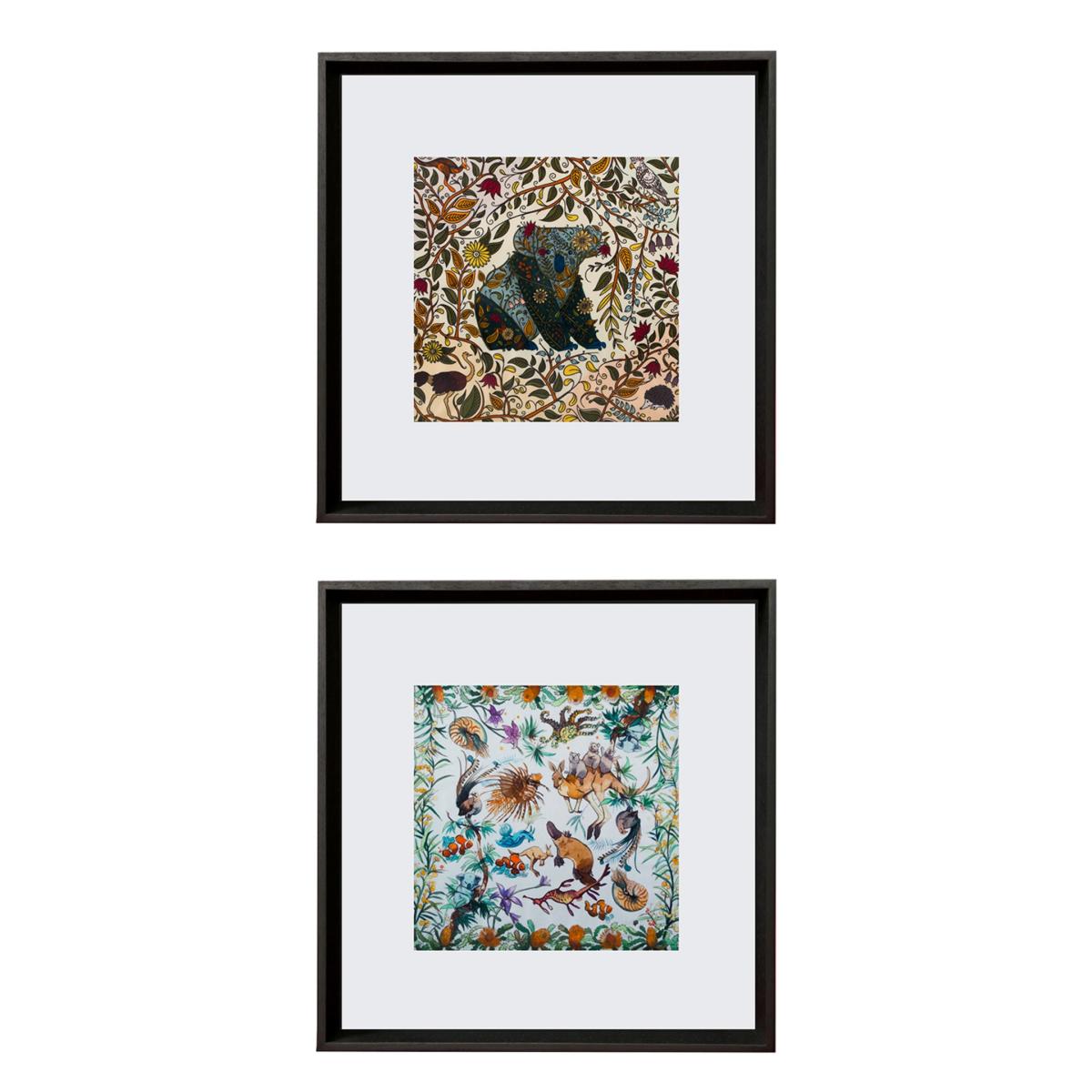 Set of four frames. 100% Ayous Tree - Wooden Frame with 100% Silk Scarves Each frame is ''32 x 32'' cm - 12.9 x 12.9 inches. Inspired by Australian biodiversity. All of our products are illustrated by hand and purposefully designed to inspire feelings of wanderlust. We hope you enjoy all of our collections. We frame our wanderlust illustrated scarves from our scarves collections to make them design art decoration for your home and launched it in 2020 as Un Poco Art. We hope our 100% Ayous tree frame with silk scarves will be in the most pleasant place of your home.