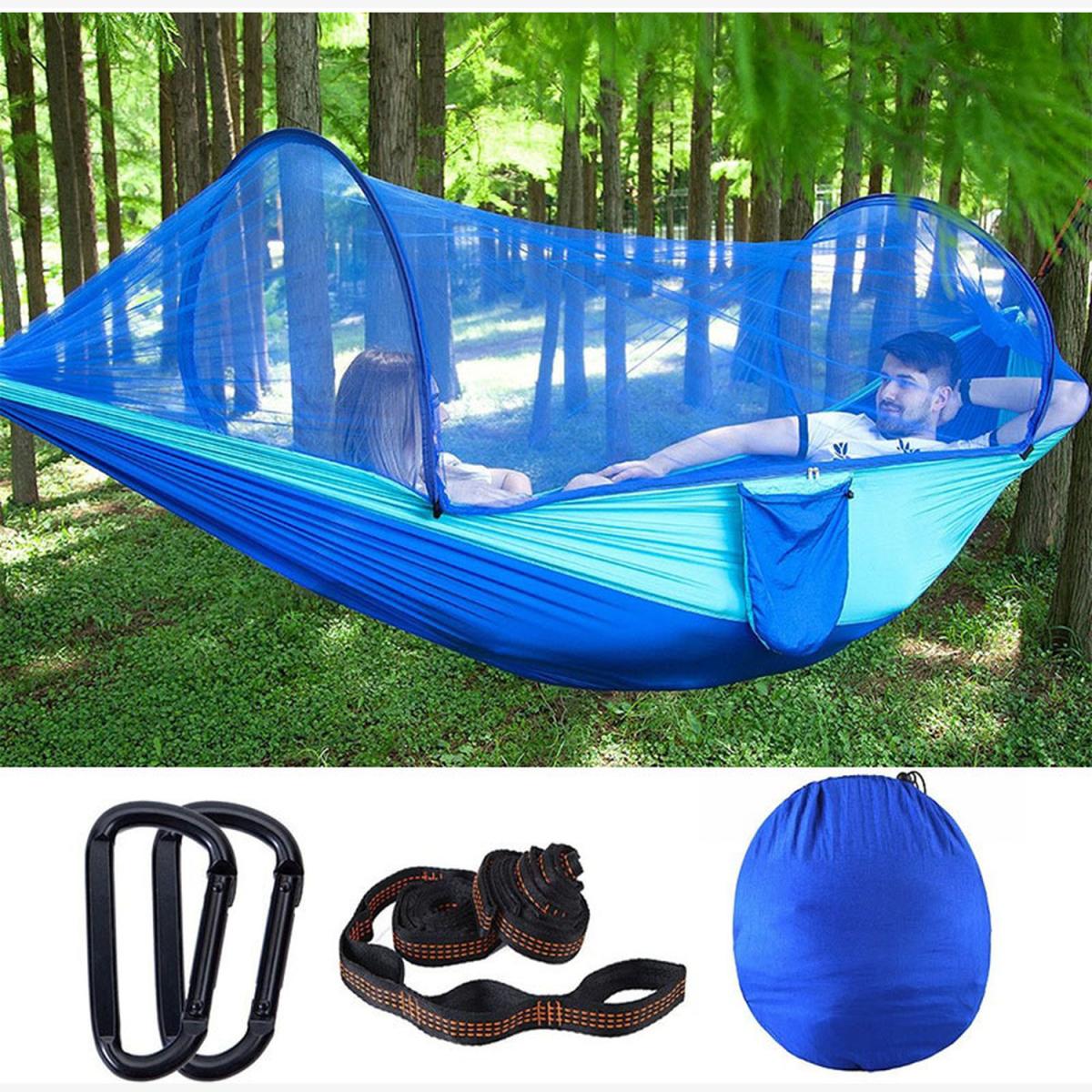 The comfortable hammock comes in a quick opening design, with buckles and belts included for a secure installation. It features a mesh mosquito net for protection while you relax. You can choose from a single or double hammock with 4 different colors,which are valid in blue, light green, pink or army green. Made from durable polyester mesh, the hammock is perfect camping or for lounging in your garden this summer. Please note the color of belt is at random.