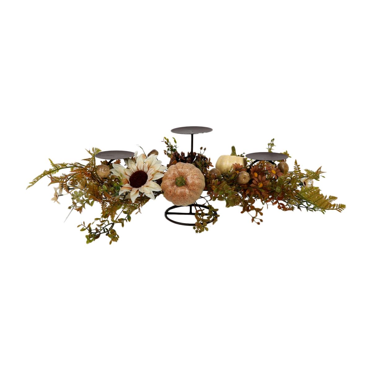 A lovely centrepiece for your dinner table, or mantelpiece, this Autumnal Bloom Candle Holder will give your home a charming, rustic quality. This candle holder has been beautifully crafted with faux leaves, flowers, and speckled pumpkins to make it feel truly autumnal. Finished with coordinating plates for your candles, this would be the perfect accessory for pillar candles, votives and tealights.