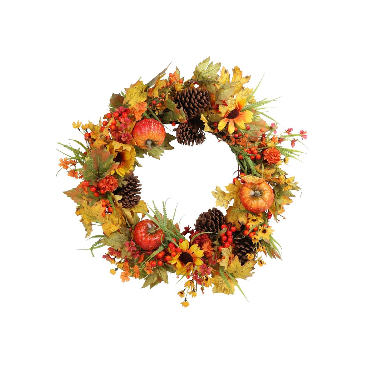A stunning and eyecatching piece of decor for your home, the Autumnal Floral Pumpkin Wreath will look gorgeous sitting on your front door. Filled with luscious and rich fake foliage in a myriad of autumnal colours: red, orange, yellow, brown, black, and green, it's bound to make anyone feel warm and cosy as they come by your house. Accented with adorable speckled pumpkins, pinecones, and flowers, this wreath and its full design is sure to become an instant favourite of yours when it comes to autumn decor. Whilst this is the ideal piece for your front door, it would look equally as impressive hanging in your window or on the living room wall for a personalised touch this autumn.
