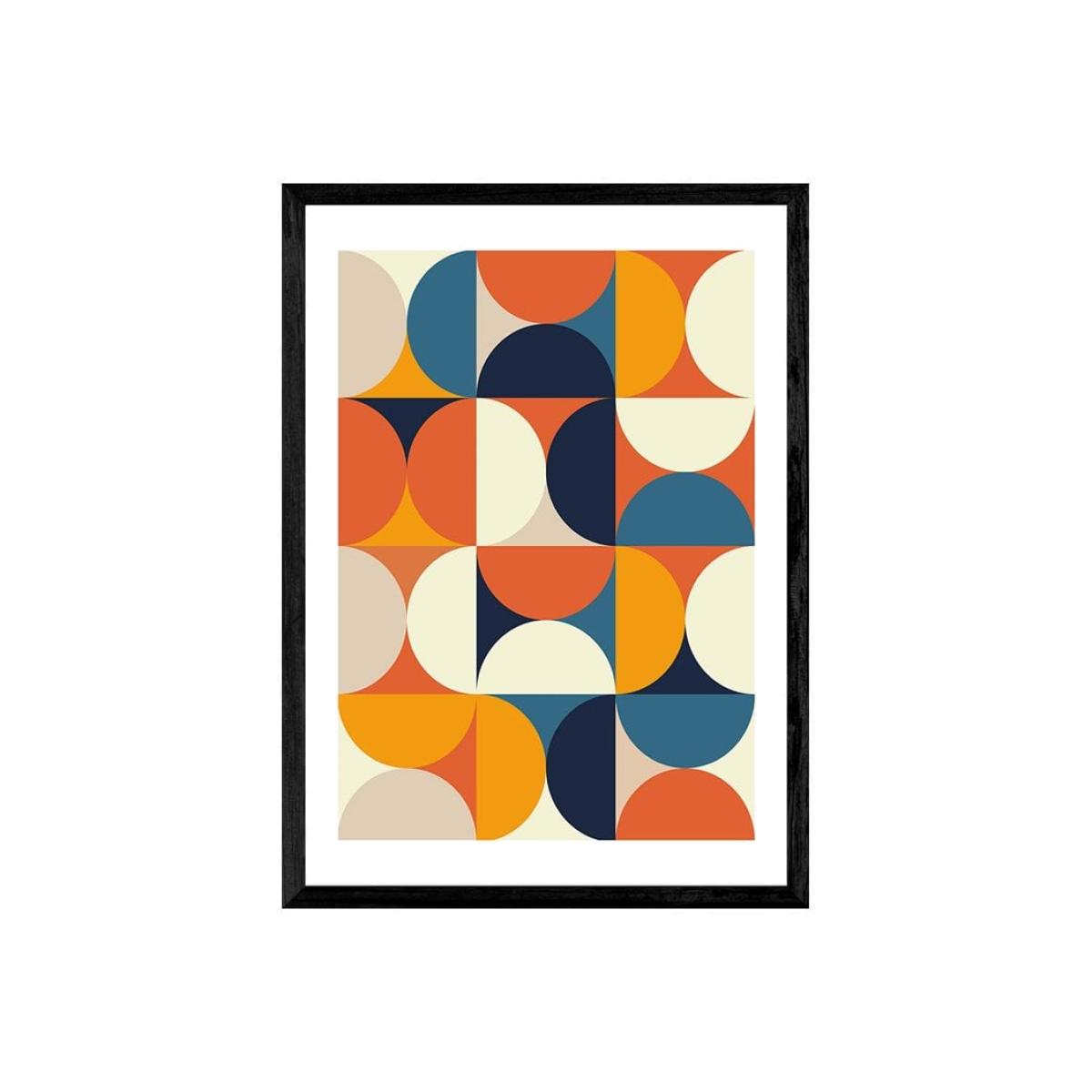 I love this graphic print for its bold, modern feel. The black background really makes the colourful geometric shapes pop, making it a striking focal point in any space. It works particularly well in contemporary or minimalist interiors where the clean lines and shapes can shine, but it can also add visual interest when paired with more neutral, subdued décor. Practical styling tips include complementing it with monochrome accessories or other black accents to create cohesion. It's ideal for framing in a spot that needs a bit of visual energy-above a sofa, in a hallway, or as part of a gallery wall-to bring a dynamic edge to the room without overwhelming the space.