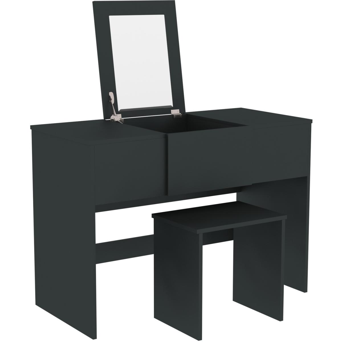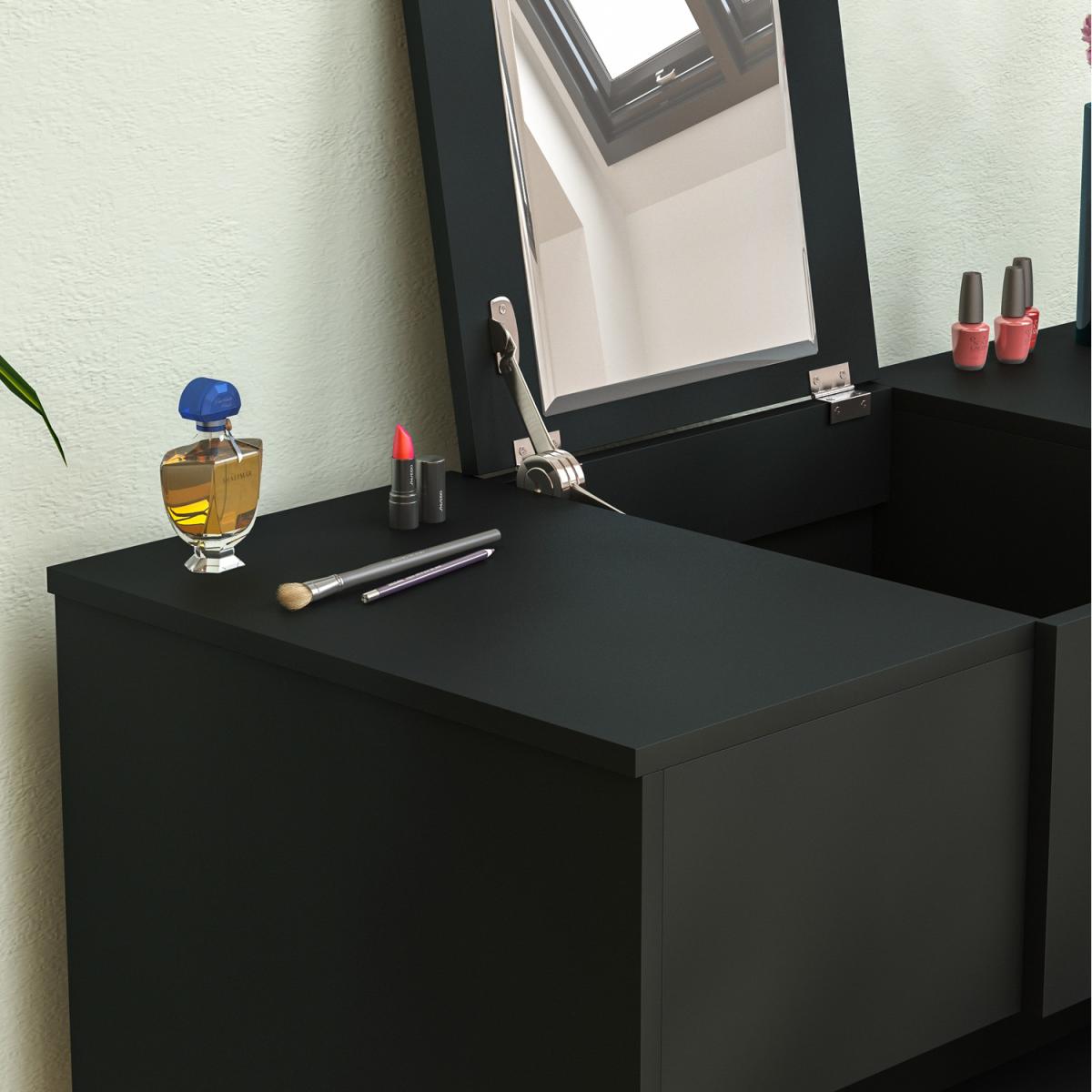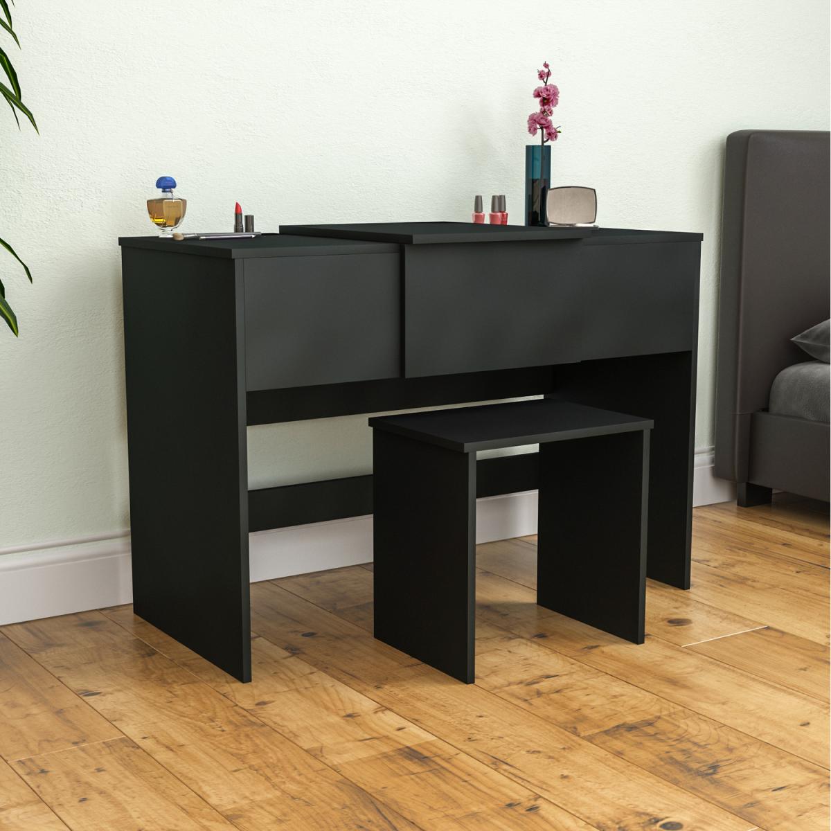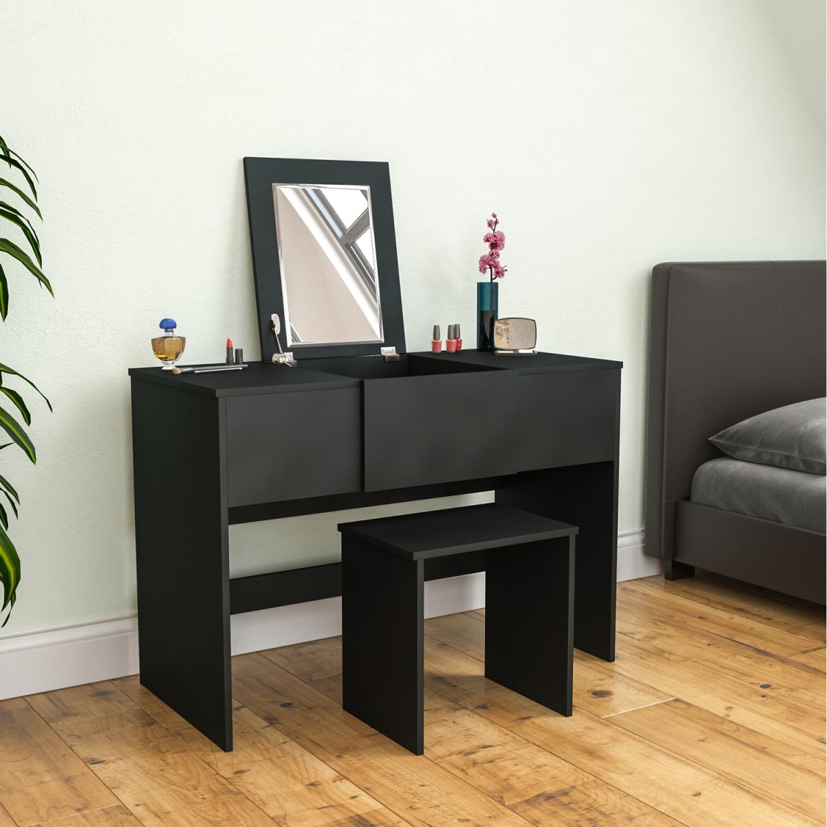 I really like this black dressing table because of its sleek, modern look that can suit a variety of interior styles, from contemporary to minimal. Its dark colour makes it a versatile statement piece that works well in both neutral and bold colour schemes. I’d suggest pairing it with metallic accessories or a coloured stool to add a touch of personality. The clean lines make it practical for organising makeup and accessories, and it’s perfect for smaller spaces where a streamlined silhouette is key. For styling tips, consider adding a couple of organised trays or organisers on the surface to keep clutter minimal yet accessible, and perhaps a soft, textured stool to balance the sleek finish of the table.