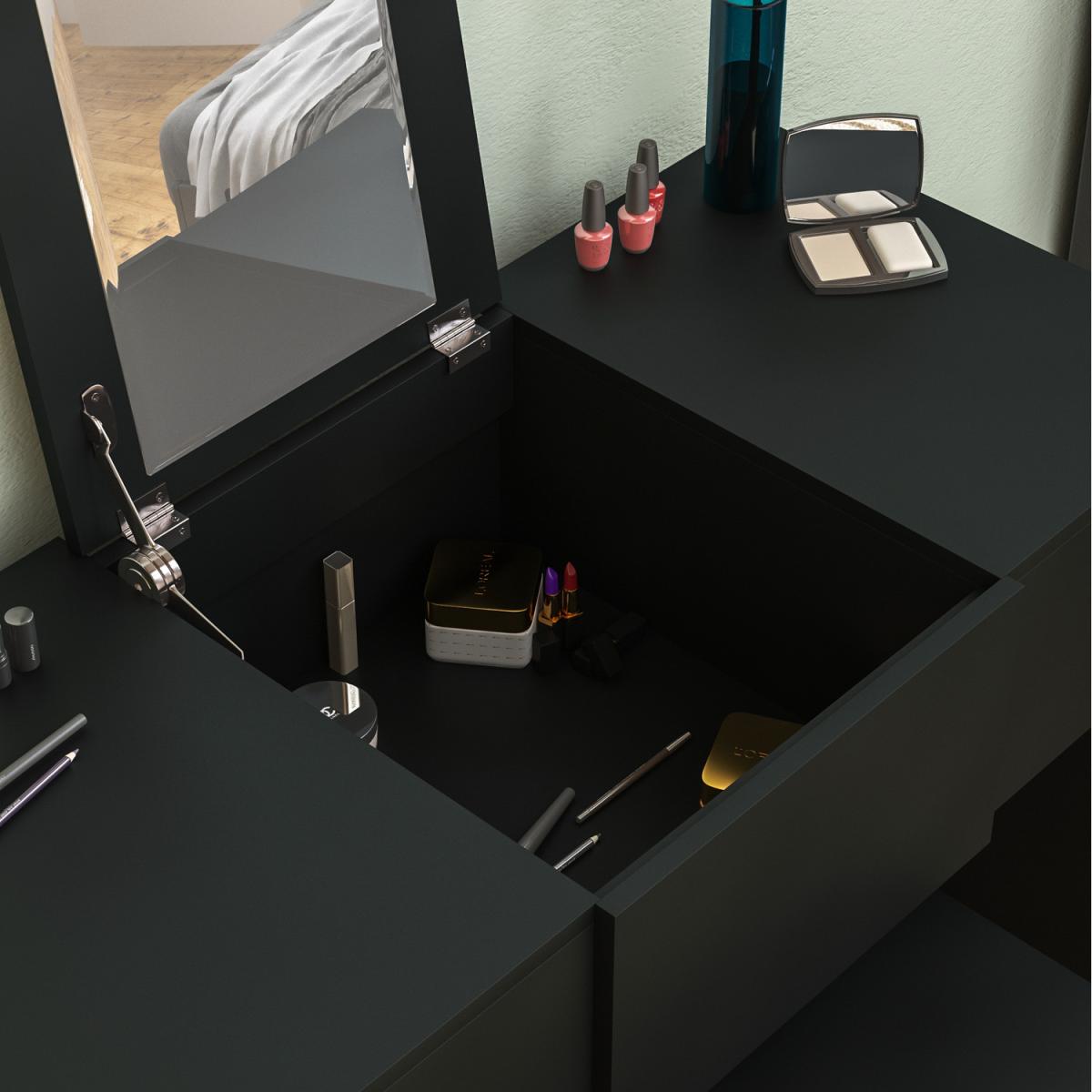 The Ava Dressing Table is a gorgeous new product with a sleek, contemporary design that is sure to leave a lasting impact on your bedroom. It comes in four neutral colours to choose from. This dressing table has a flip-top panel that opens to expose a mirror and a storage space for your jewellery, brushes, and cosmetics. The dressing table's smooth top has space for cosmetics and beauty products, and it comes with a chic stool to match.