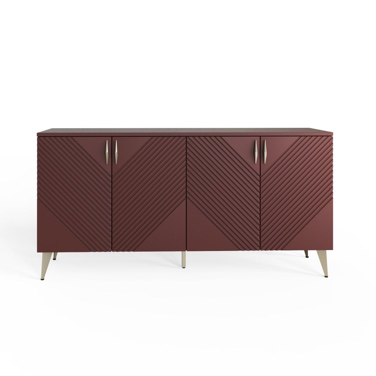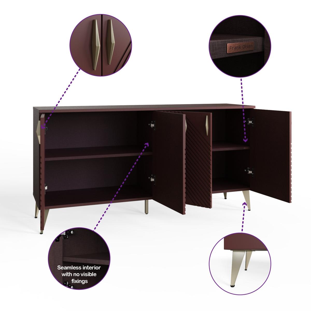 * Glamorous design* 4 Doors* Matte painted finish* Gold features* SMART LE Ds, Voice Commanded, App Compatible* Wireless Charging Boasting a refined matte painted finish and accented with muted gold brushed shard handles and feet, this sideboard exudes boutique sophistication. Inside, discover ample and flexible storage space, featuring Frank Olsen's scratch-resistant midnight purple interior, a testament to enduring style. Seamlessly integrating smart technology, control the LED lights via an app or voice commands through your smart speaker, allowing you to set the perfect ambiance effortlessly. Enjoy added convenience with the discreet wireless charging point, effortlessly powering up your phone while blending technology and functionality seamlessly. This sideboard assembles an estimated five times faster than standard products, featuring a revolutionary construction design that ensures a sleek, flawless finish with no visible fixings.