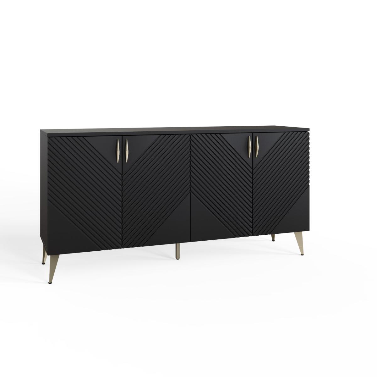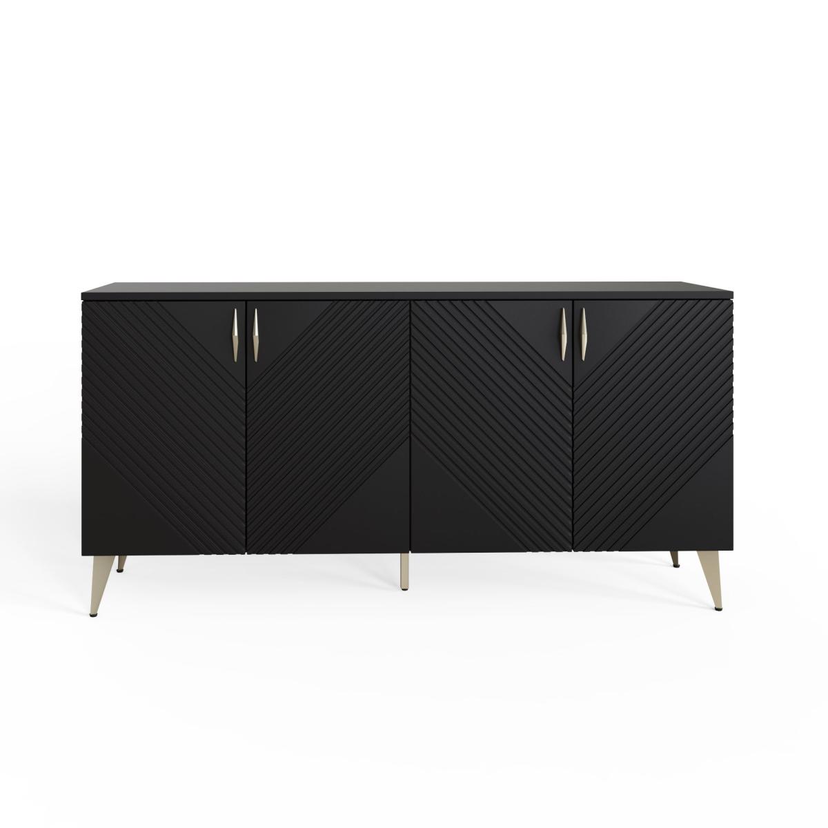 * Glamorous design* 4 Doors* Matte painted finish* Gold features* SMART LE Ds, Voice Commanded, App Compatible* Wireless Charging Boasting a refined matte painted finish and accented with muted gold brushed shard handles and feet, this sideboard exudes boutique sophistication. Inside, discover ample and flexible storage space, featuring Frank Olsen's scratch-resistant midnight purple interior, a testament to enduring style. Seamlessly integrating smart technology, control the LED lights via an app or voice commands through your smart speaker, allowing you to set the perfect ambiance effortlessly. Enjoy added convenience with the discreet wireless charging point, effortlessly powering up your phone while blending technology and functionality seamlessly. This sideboard assembles an estimated five times faster than standard products, featuring a revolutionary construction design that ensures a sleek, flawless finish with no visible fixings.