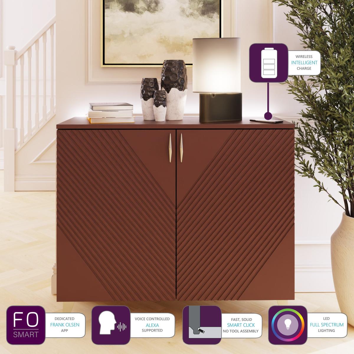 * Glamorous design* 2 Doors* Matte painted finish* Gold features* SMART LE Ds, Voice Commanded, App Compatible* Wireless Charging This sideboard is a glamorous and contemporary addition to your living space with smart features that redefine functionality. Its refined painted finish, paired with muted gold brushed shard handles and feet, exudes boutique sophistication. Inside, discover versatile storage for tableware, linens, or a chic drinks cabinet, with ample space for wine, spirits, and glassware. Frank Olsen's signature scratch-resistant midnight purple interior embodies enduring style. Seamlessly integrating smart technology, control the LED lights through an app or voice commands via your smart speaker, setting the perfect ambience effortlessly. Enjoy added convenience with the discreet wireless charging point, effortlessly powering up your phone while seamlessly blending technology and functionality.