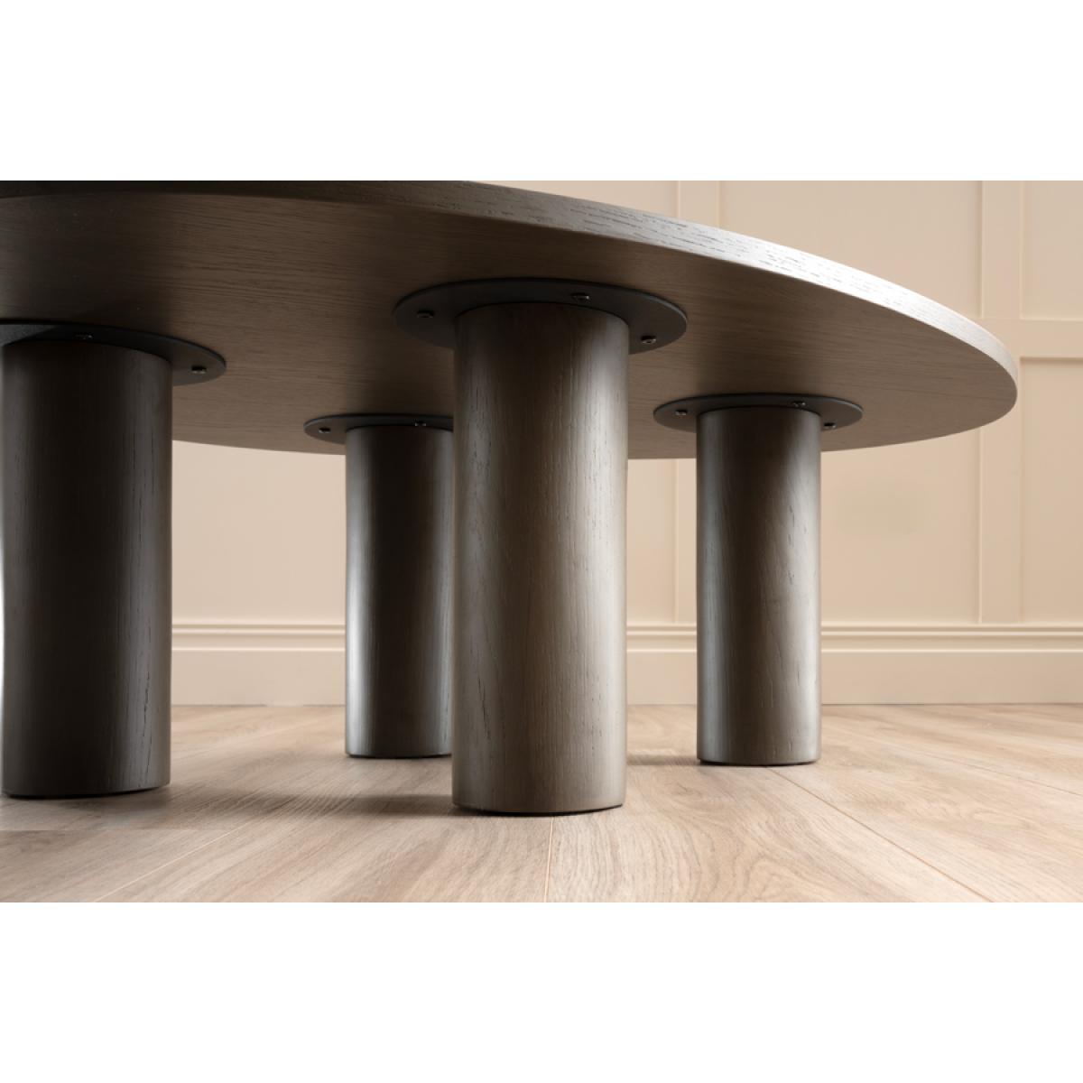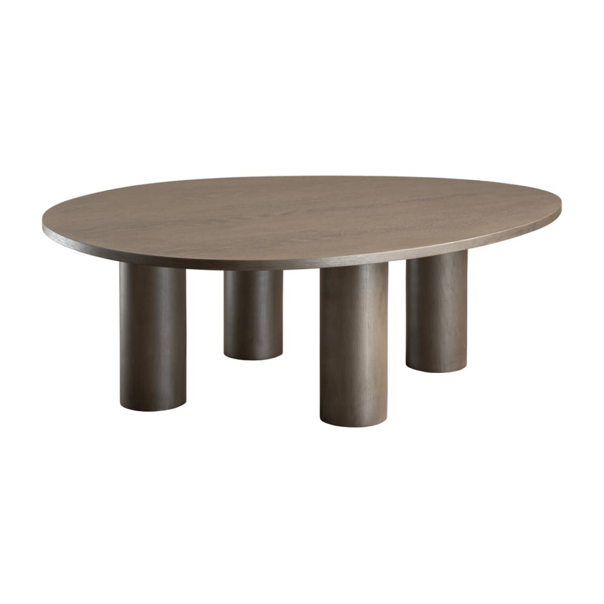 An organic-shaped coffee table inspired by the Japandi design style. Substantially weighted wooden pedestal legs. Oak veneer with satin wenge stain. Assembly required, simply attach the legs to the top.