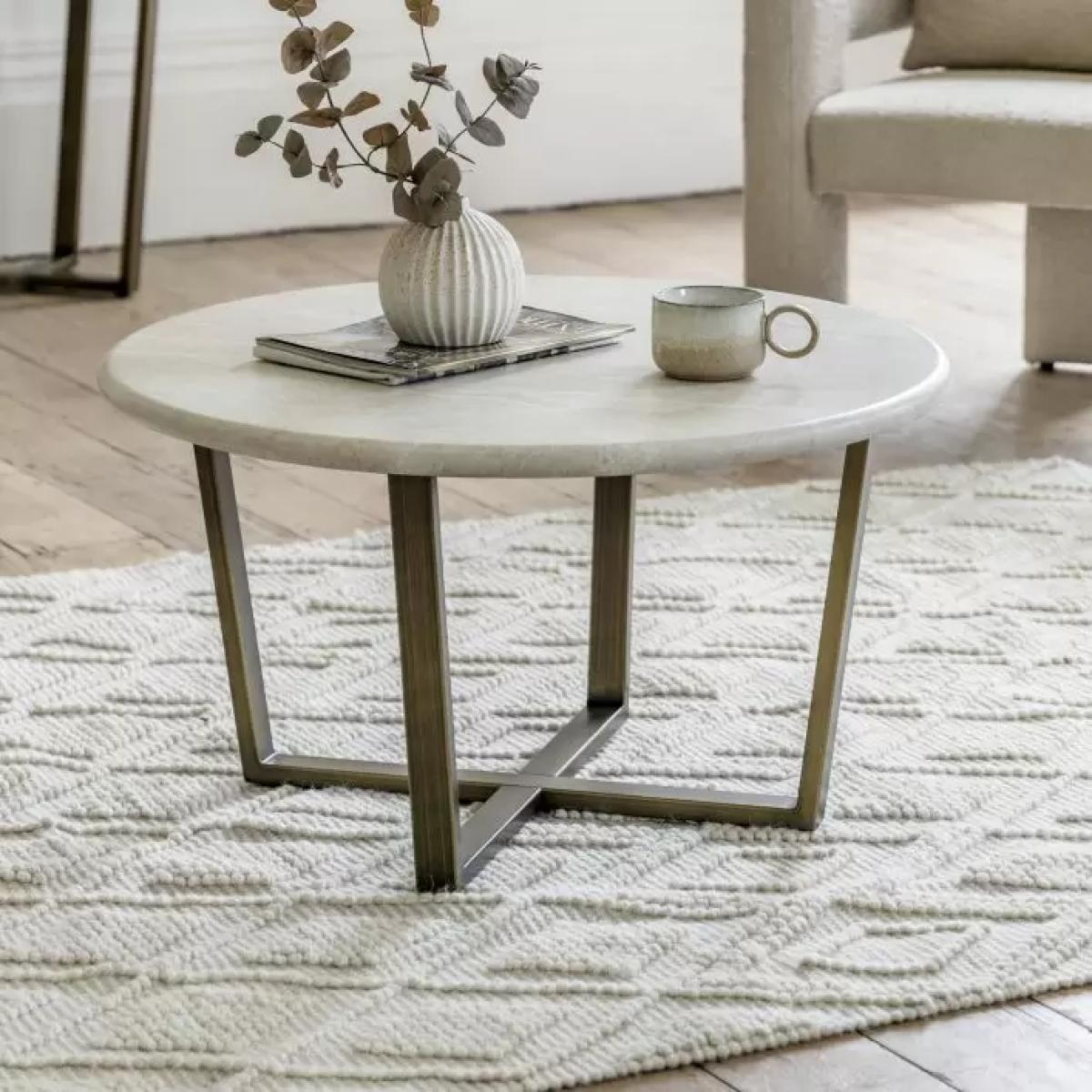 Add a touch of sophisticated elegance to a room with this lovely coffee table. The top features the most amazing travertine faux finish which is created with the latest state of the art technology to give the look and feel of the real thing but without the weight and technical difficulties. The faux travertine pairs beautifully with the metal base which has a classy bronzed brass finish, to give an understated luxury style, perfect for any classic modern interior. Matching items also available. Material:Glass Fibre Reinforced Concrete 50% / Steel 50%. Colour/Finish: Travertine.