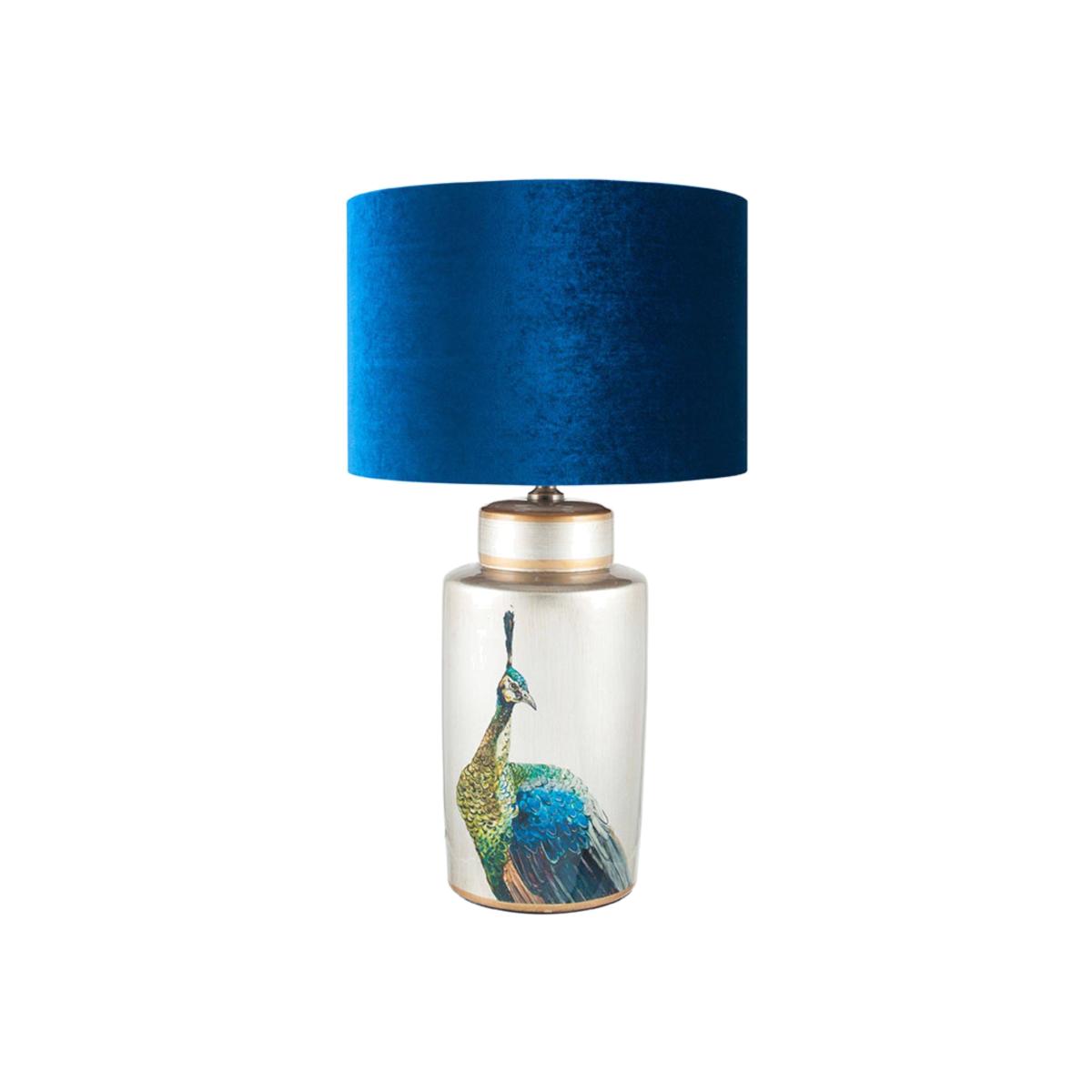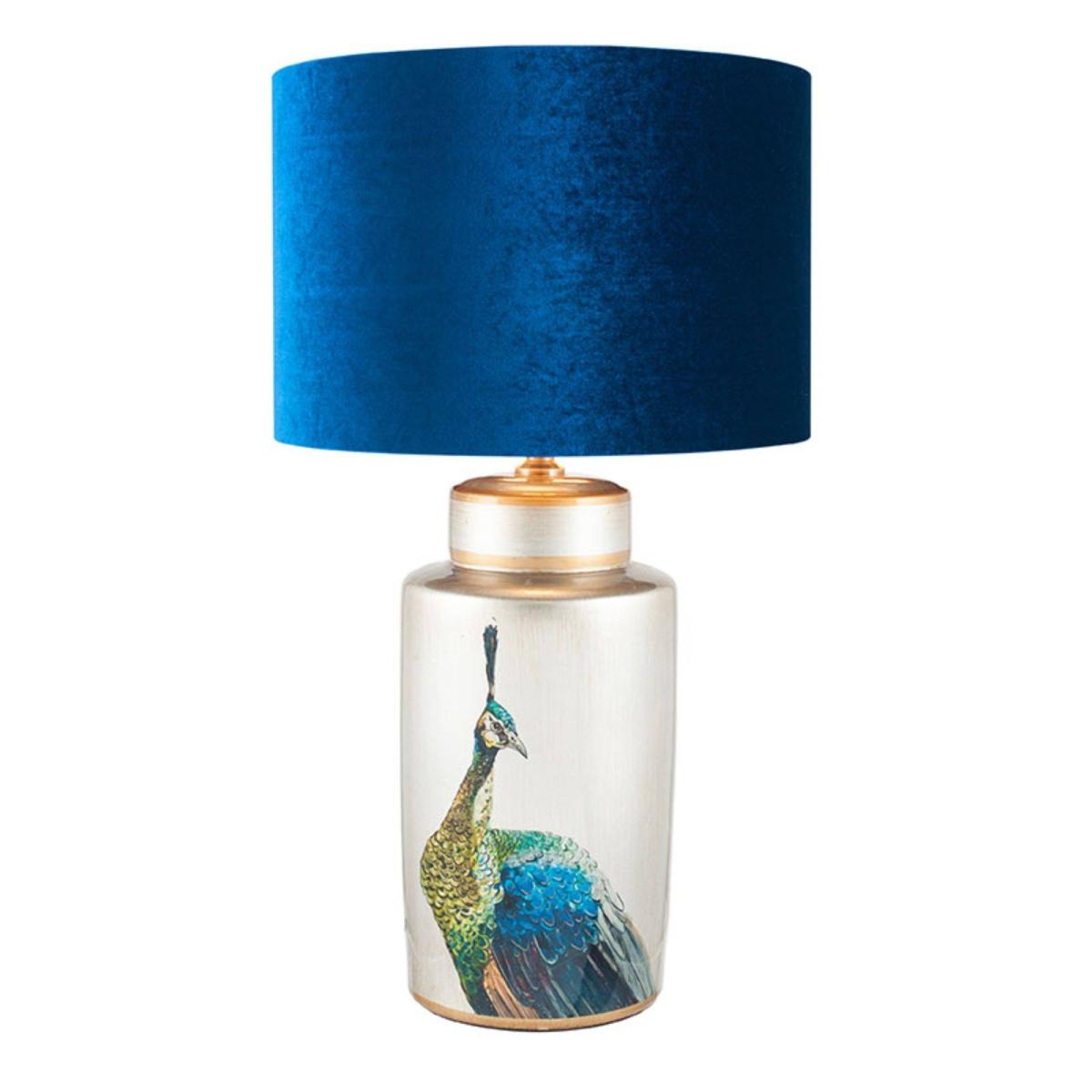 Add a pop of colour to your interior with this showstopper peacock table lamp. Add the wow factor to your home interiors with the fabulous Avas Peacock table lamp. Boasting a beautiful and vibrant hand-painted peacock on a metallic silver background, this table lamp is complete with a rich and luxurious sapphire blue velvet lampshade, perfect for adding a statement accent into any room!.