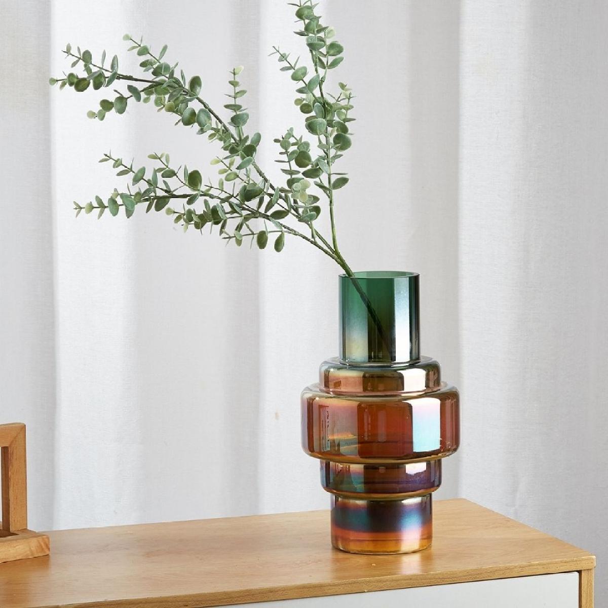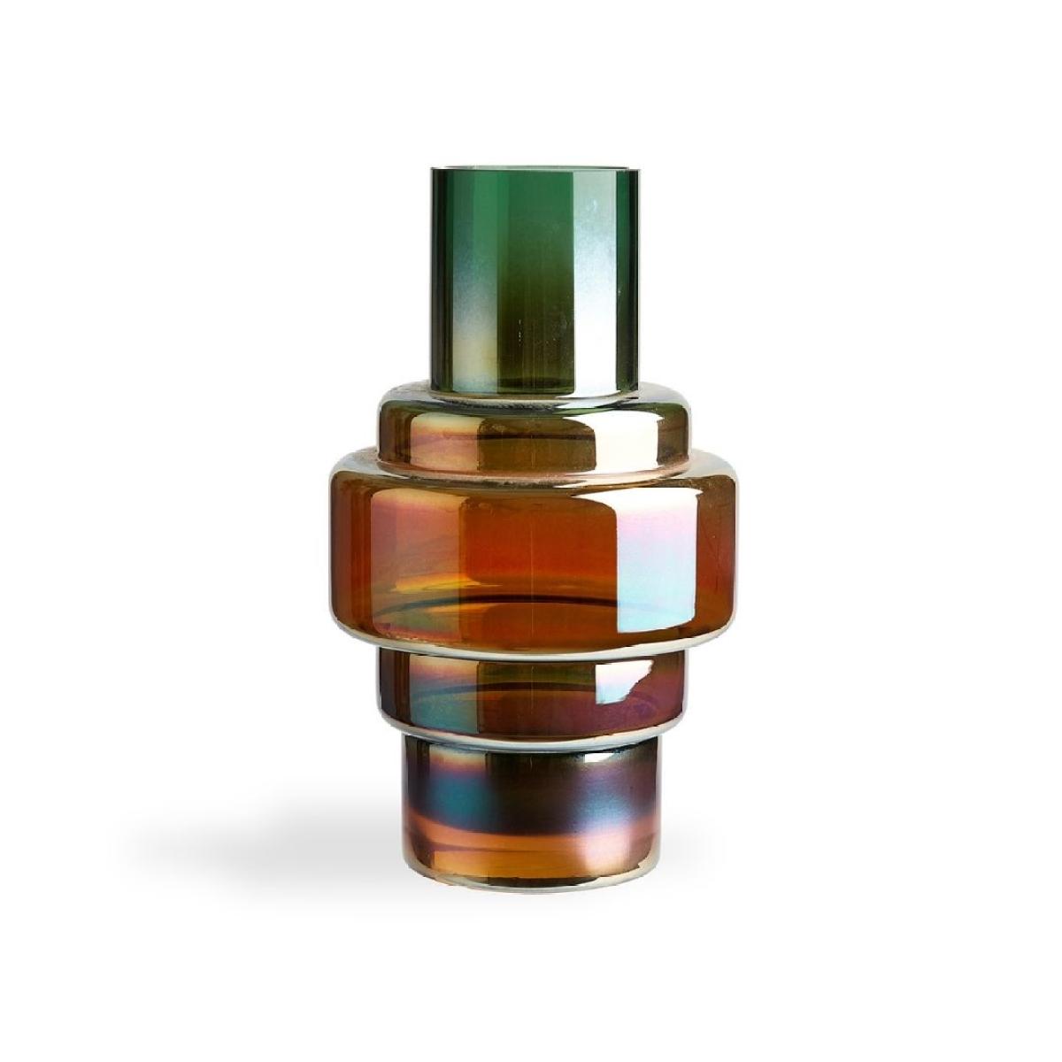 Avelino stacked green glass vase with a petrol-effect finish.   Avelino stacked green glass vase with a petrol-effect finish.