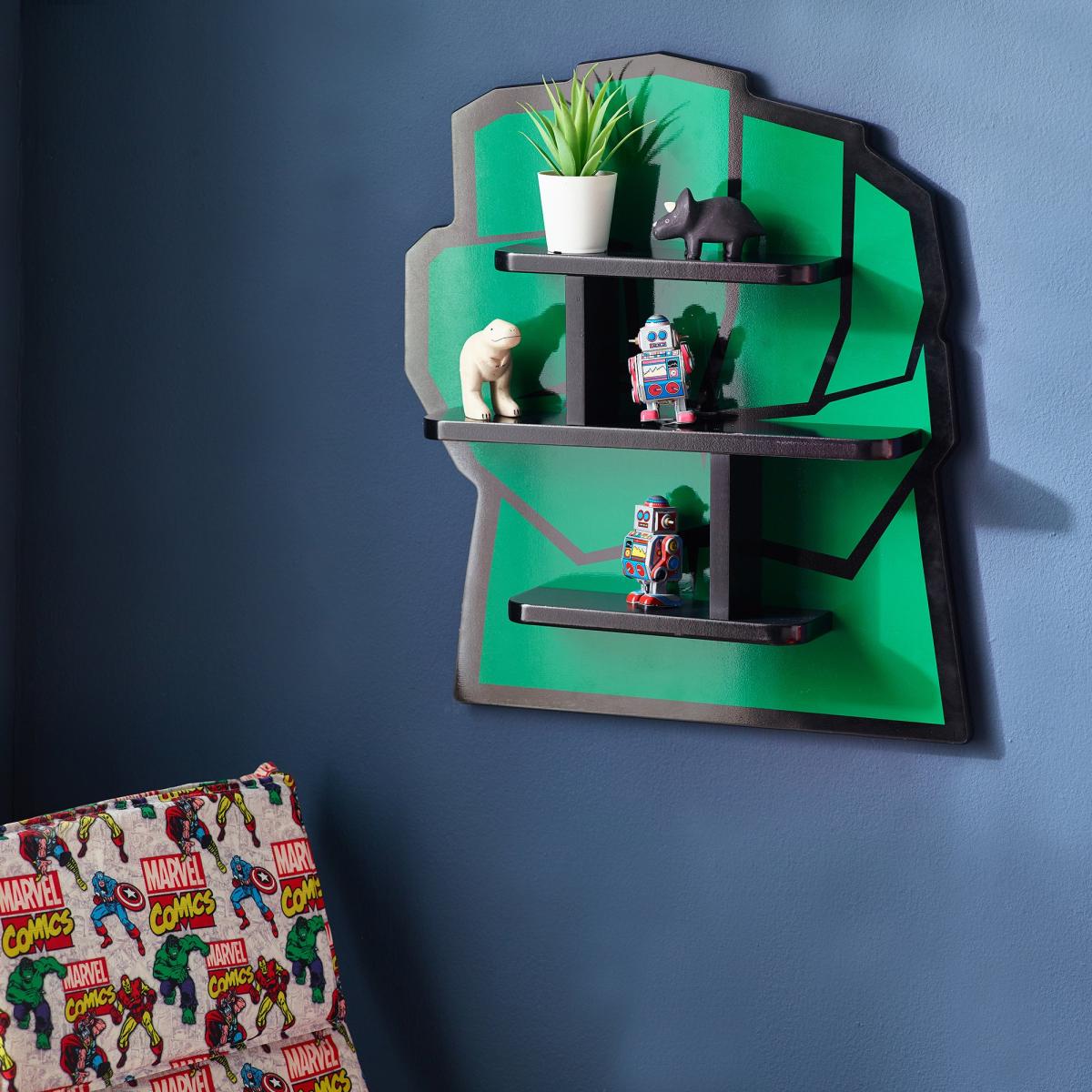 * 3 x Shelves* Wall mounted shelf* Silhouette design Inspired by the mighty Marvel character, Hulk, these wall shelves brings the excitement of superhero adventures right into your child's room. Crafted with attention to detail and featuring vibrant Hulk graphics, they add a touch of action and fun to any space.