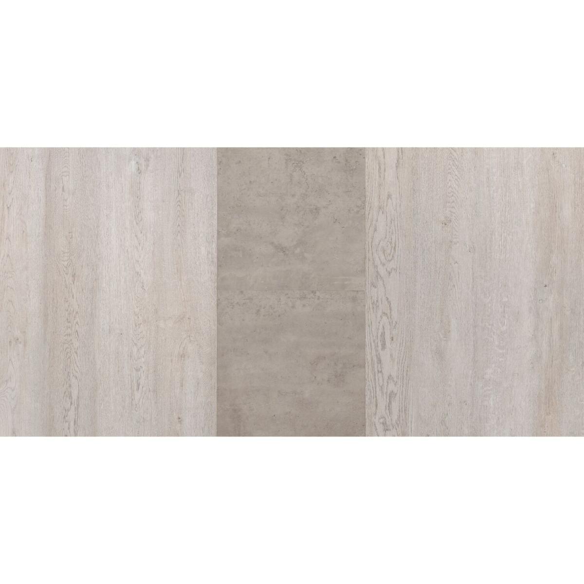 Elevate your dining space with the Avery Extending Dining table with a contemporary two-tone table, sleek silhouette and industrial, black legs. The set extends from 120cm to 160cm - perfect for everyday dinners or for dinner parties. Contemporary two-tone concrete and grey oak effect table.
