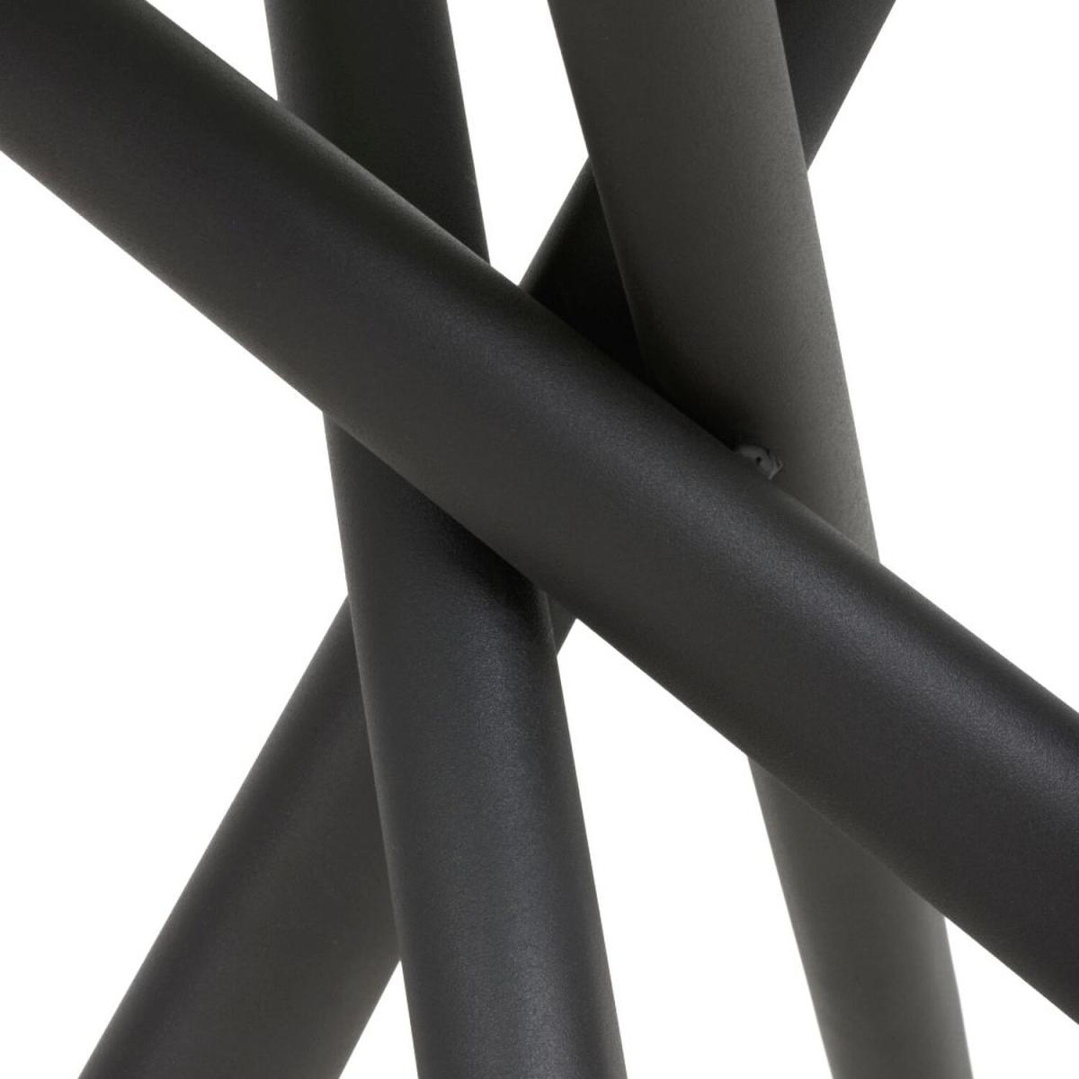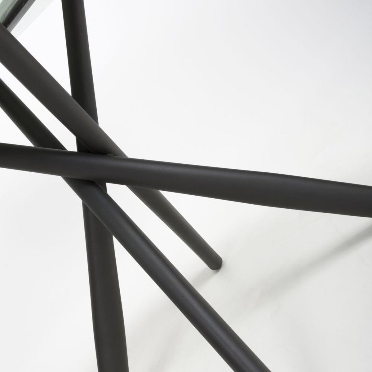 This sleek and contemporary round dining table combines a tempered glass top with a stylish overlapping metal leg frame. The 1m marble effect grey tabletop comfortably seats 4 people. Black powder-coated metal cross-frame legs.