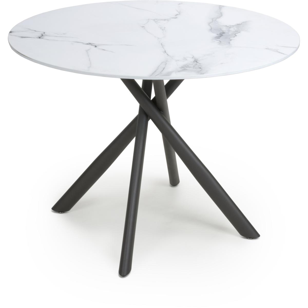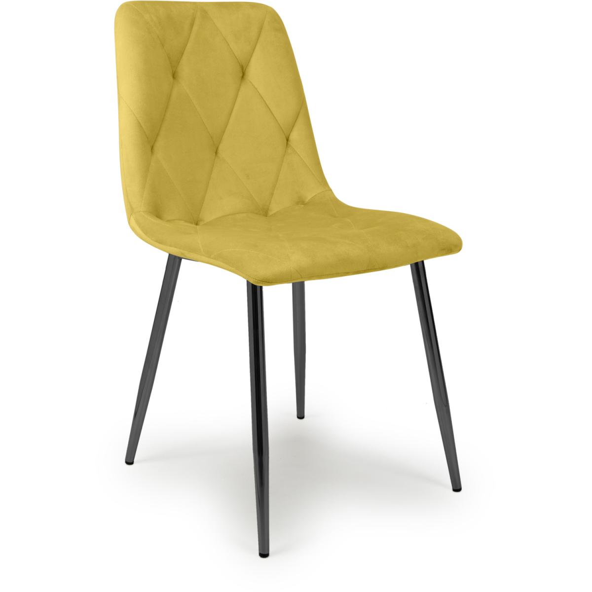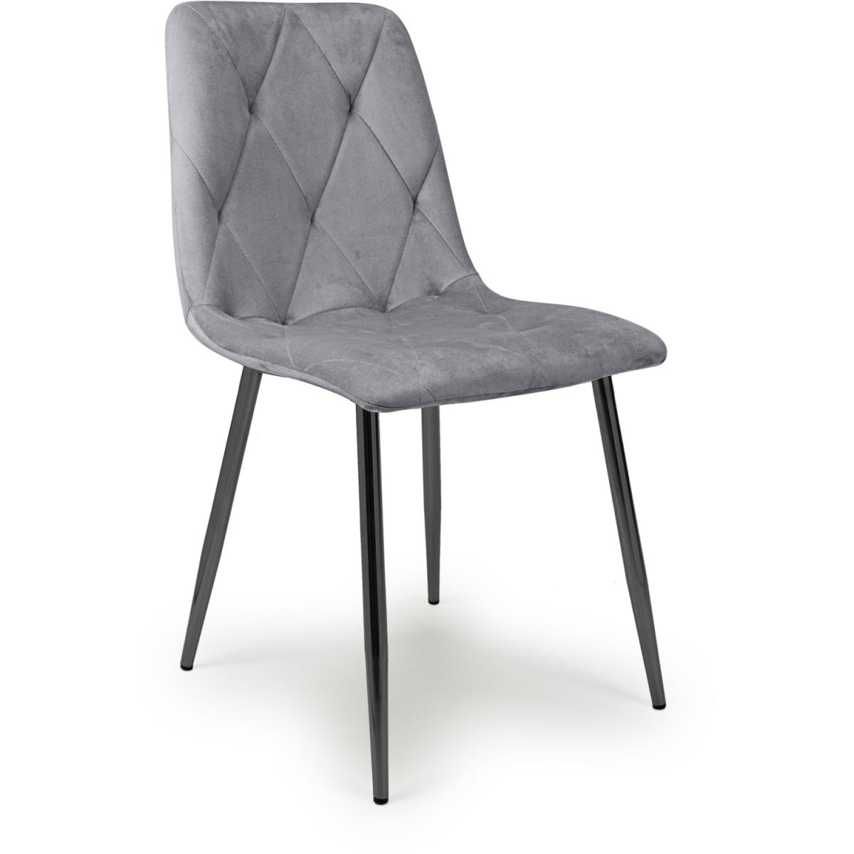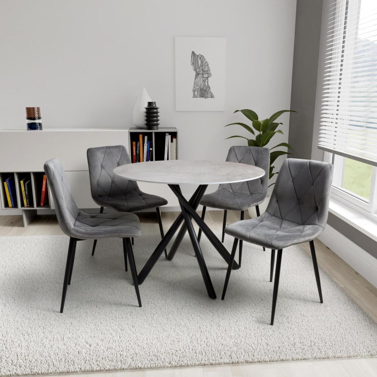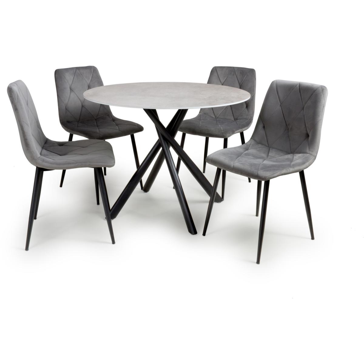 A contemporary dining set, combining a round tempered glass table with 4 sleek brushed velvet chairs. This 1m table comfortably seats 4 people. The table and chairs come with stylish matching black metal legs. Assembly required.